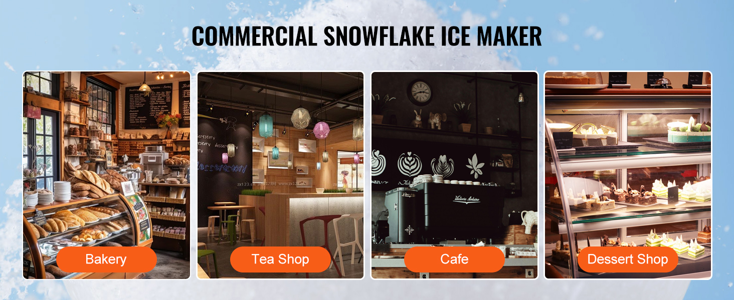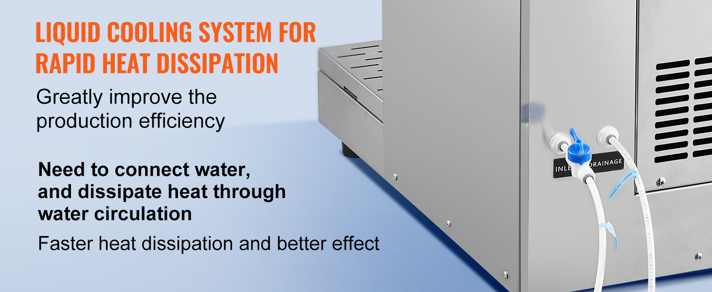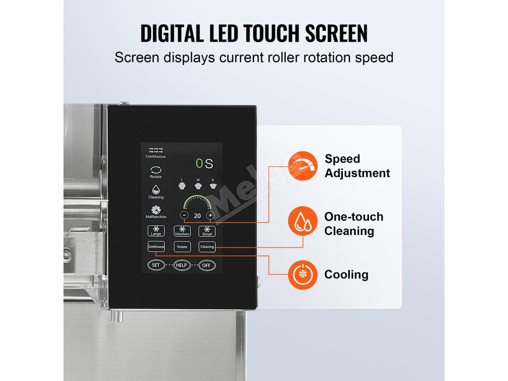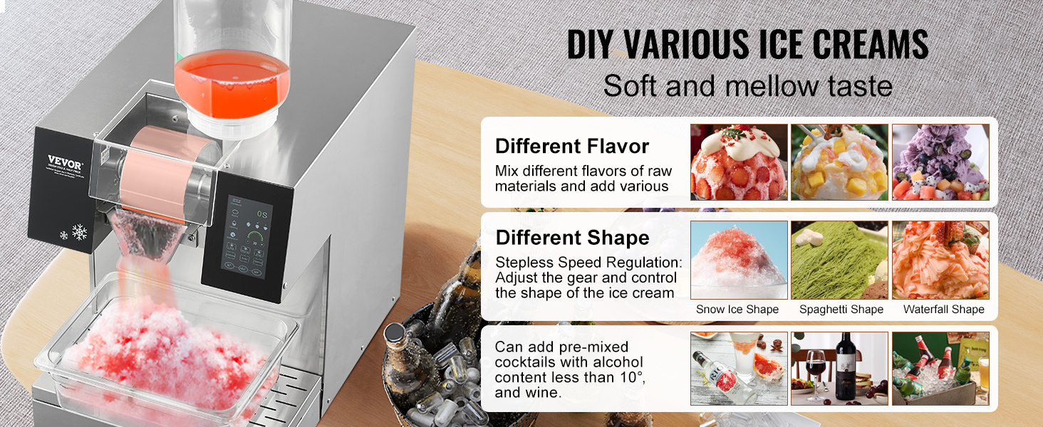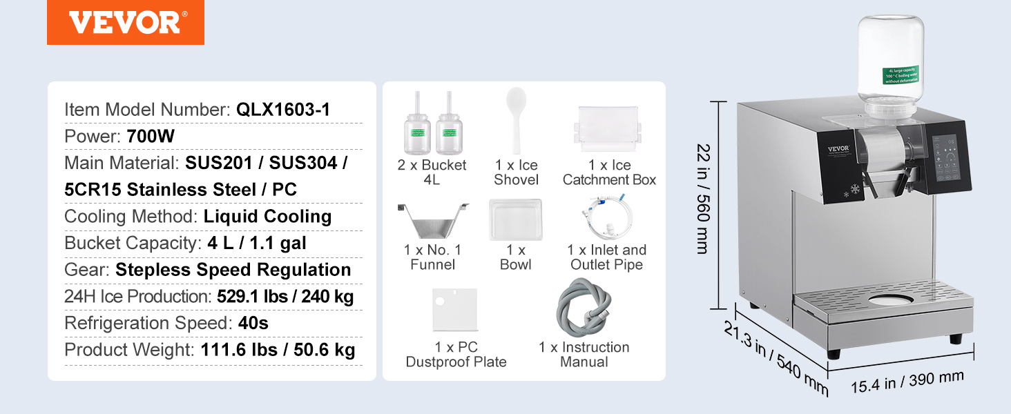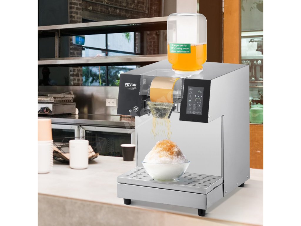 Tento kvapalinou chladený stroj na výrobu snežienok je vybavený výkonným 700W kompresorom, ktorý dosahuje rýchle chladenie v priebehu 40 sekúnd. Môže sa pochváliť dvoma košmi s objemom 4 l, ktoré dokážu za 24 hodín vyrobiť až 529,1 lbs / 240 kg ľadu, čo je ideálne na vytváranie rôznych druhov mliečnej zmrzliny s rôznou textúrou.