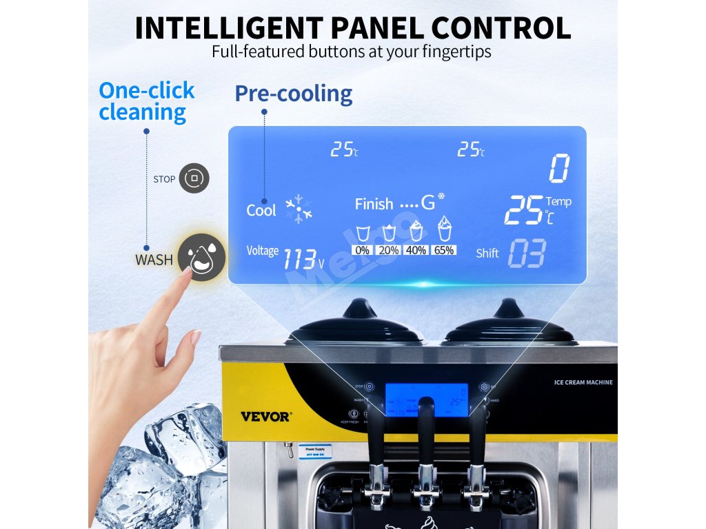 Zmrzlinovač má funkciu čistenia jedným tlačidlom. Pri čistení zmrzlinovača stačí naliať vodu do násypky, stlačiť tlačidlo čistenia na automatické čistenie, zopakovať uvedené kroky 2-3 krát a je hotovo.