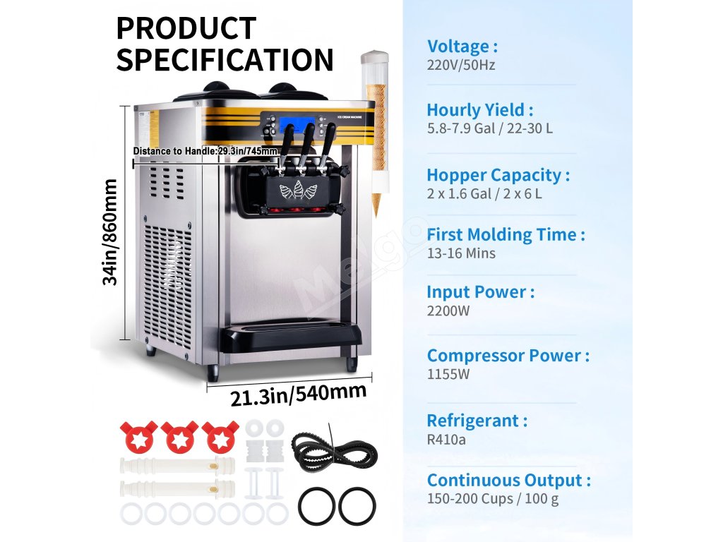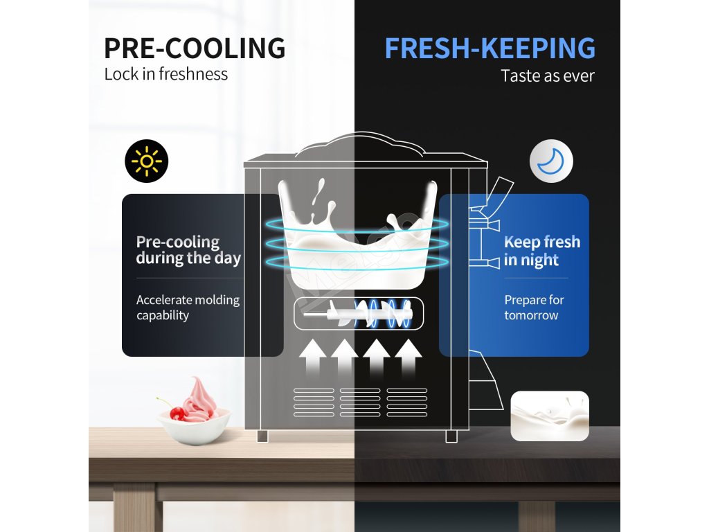 Tento komerčný stroj na výrobu zmrzliny dokáže vašim priateľom alebo zákazníkom v krátkom čase poskytnúť dostatočné množstvo mäkkej zmrzliny, krému, jogurtu, gelata a sorbetu. Má široké uplatnenie v snack baroch, kaviarňach, nápojových obchodoch, reštauráciách, pekárňach, bufetoch, reťazcoch rýchleho občerstvenia atď. a spĺňa vaše každodenné obchodné požiadavky.