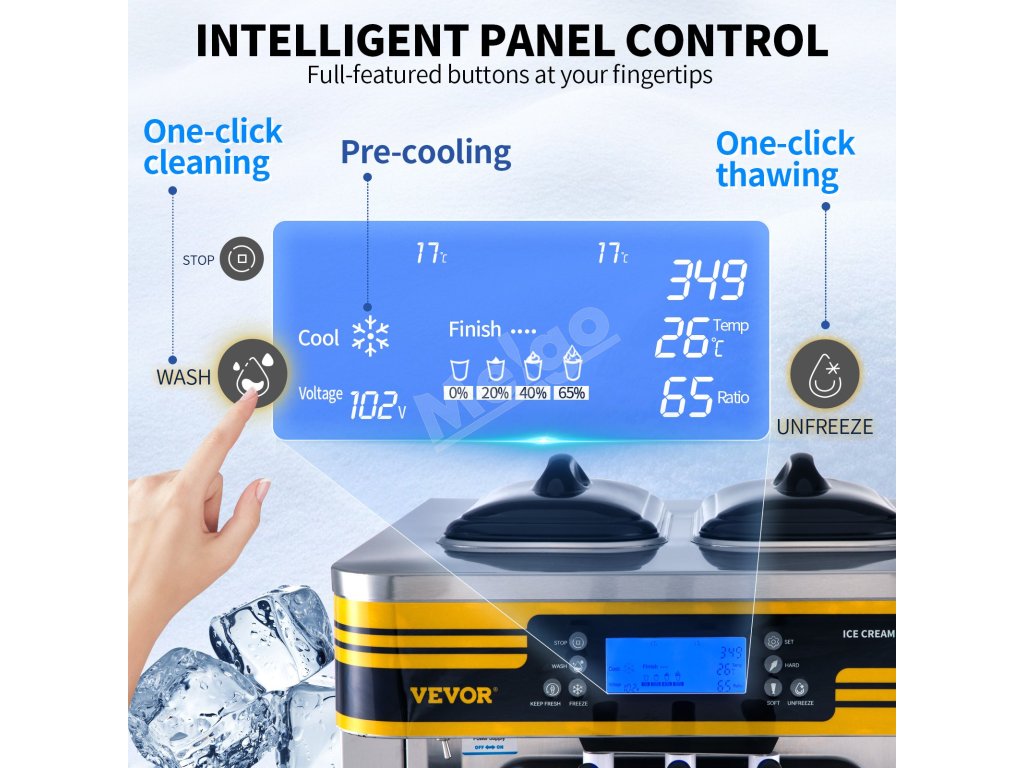 Zmrzlinovač má funkciu čistenia jedným tlačidlom. Pri čistení zmrzlinovača stačí naliať vodu do násypky, stlačiť tlačidlo čistenia na automatické čistenie, zopakovať uvedené kroky 2-3 krát a je hotovo.