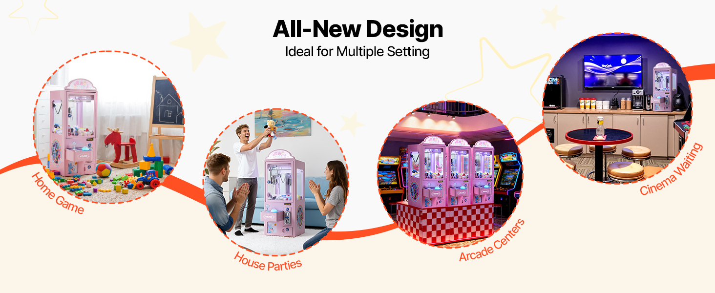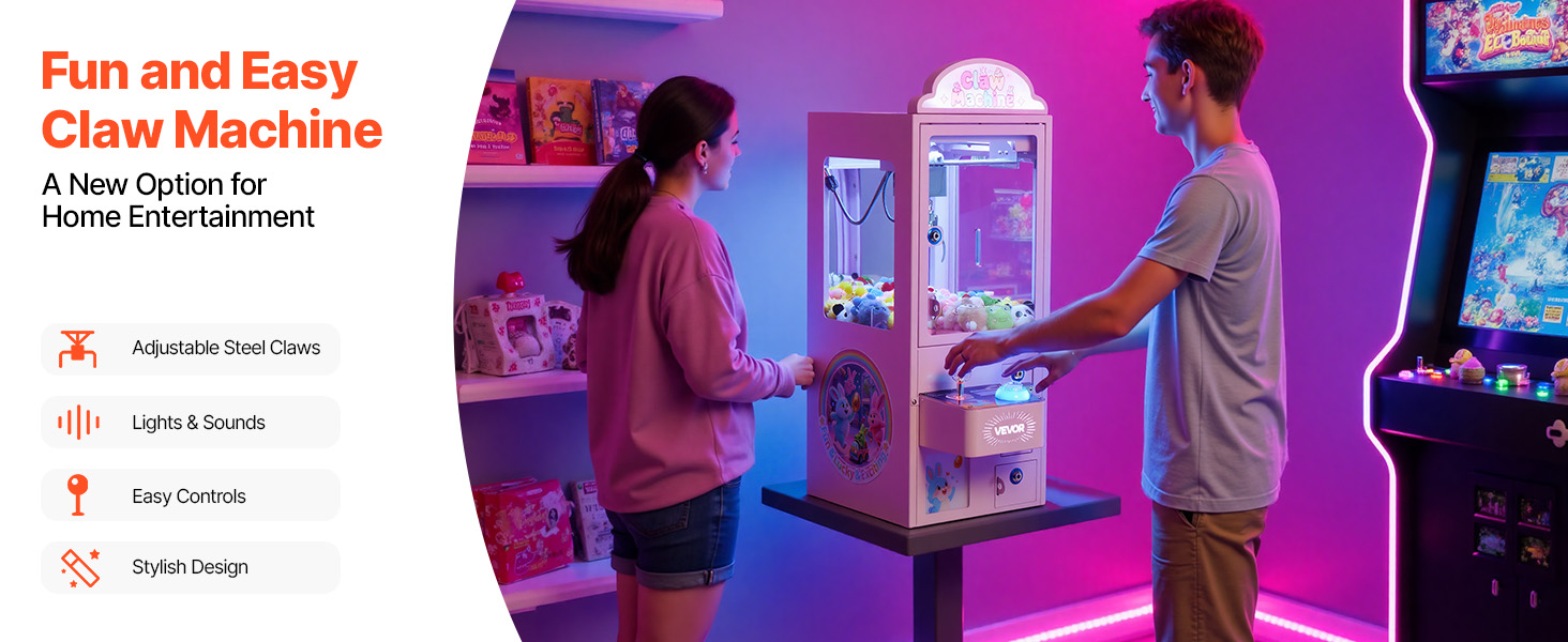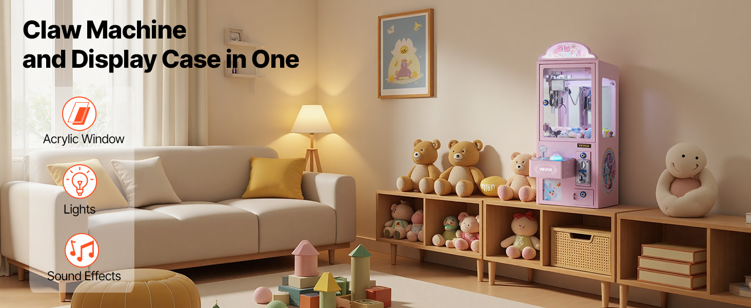 Žeriavový automat VEVOR je vybavený priehľadným akrylovým okienkom na prezentáciu zberateľských predmetov, živými svetlami na zlepšenie atmosféry a dynamickými zvukovými efektmi počas hry, čím ponúka zábavu aj zobrazovaciu funkciu v jednom zariadení.