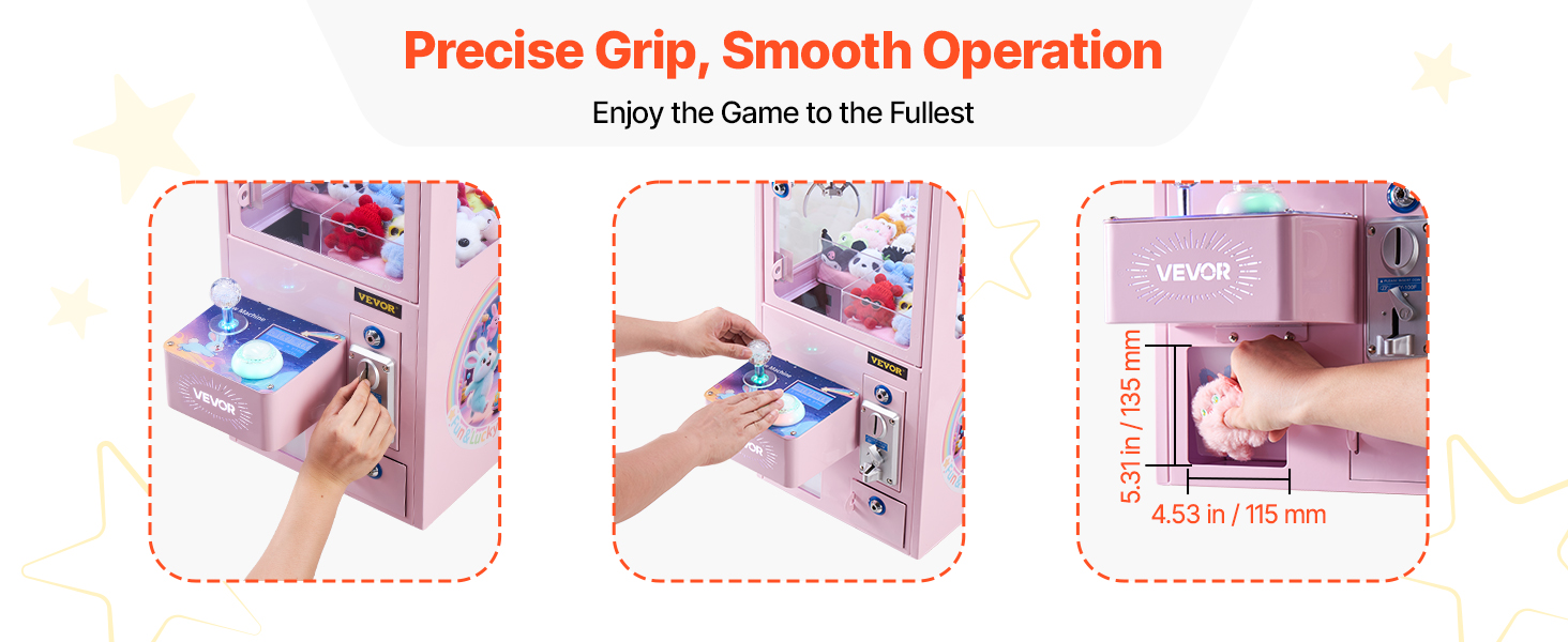 Ovládací panel sa ľahko používa a umožňuje hráčom presne manévrovať oceľovým pazúrom, aby uchopili hračky rôznych veľkostí. Ponúka výzvu aj odmenu, vďaka čomu je zábavnou voľbou na domáce alebo komerčné hranie.