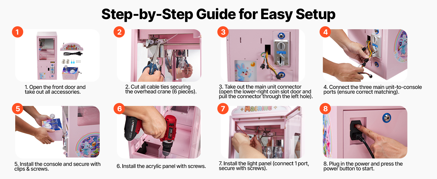 Žeriavový automat sa dodáva s podrobným návodom na použitie a všetkými potrebnými dielmi, vďaka čomu ho môžu rýchlo zostaviť aj začiatočníci a začať si užívať nekonečnú zábavu.