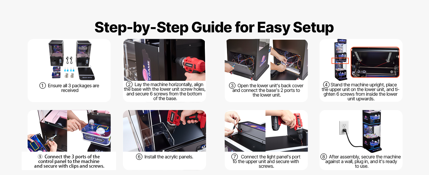 Súčasťou je podrobný návod na použitie a všetky potrebné diely. Žeriavový automat môžu začiatočníci rýchlo zostaviť a začať si užívať hodiny zábavy v štýle arkád.