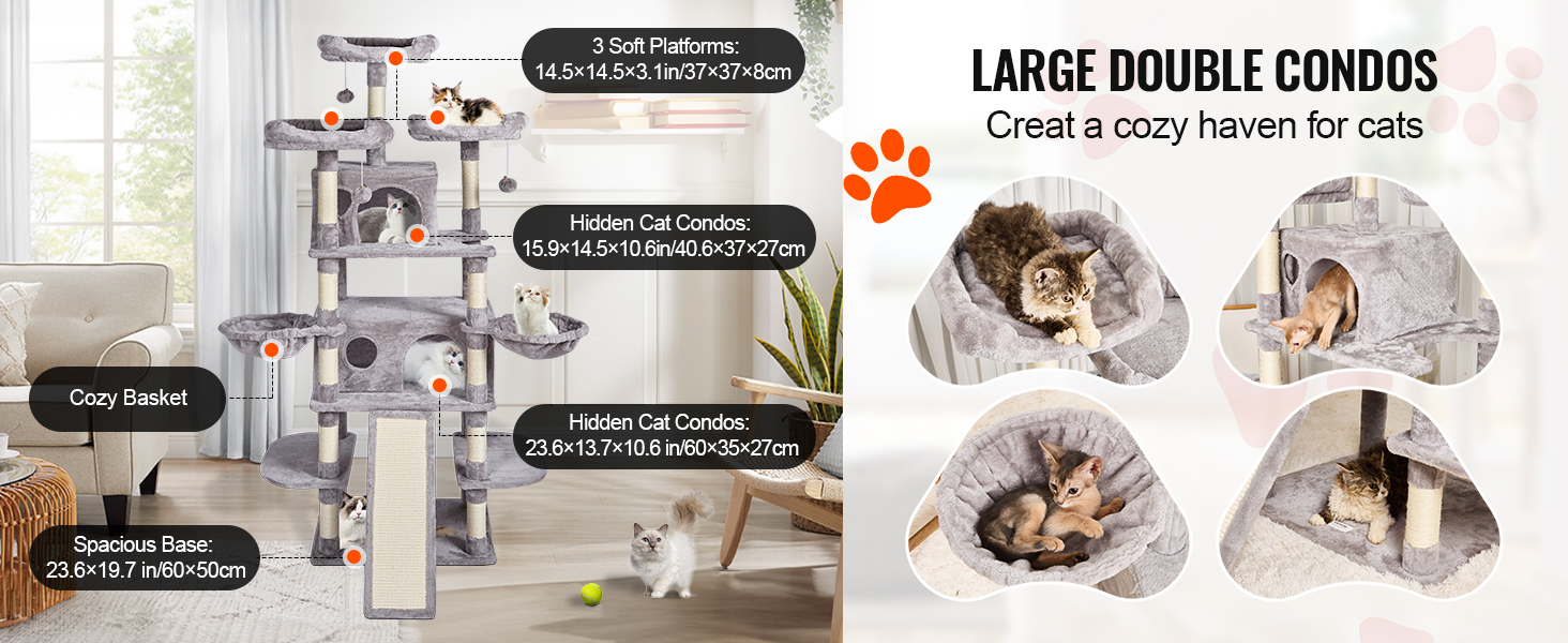 Nechajte mačky užívať si pohodlné a bezpečné prostredie na tejto veži pre mačky. S rôznymi oddychovými zónami vrátane priestrannej základne, 2 útulných hojdacích sietí, 2 skrytých mačacích kondomínií a mäkkých horných hojdacích sedadiel, na ktorých sa mačky môžu vyvaľovať, schovávať alebo vysoko sedieť.