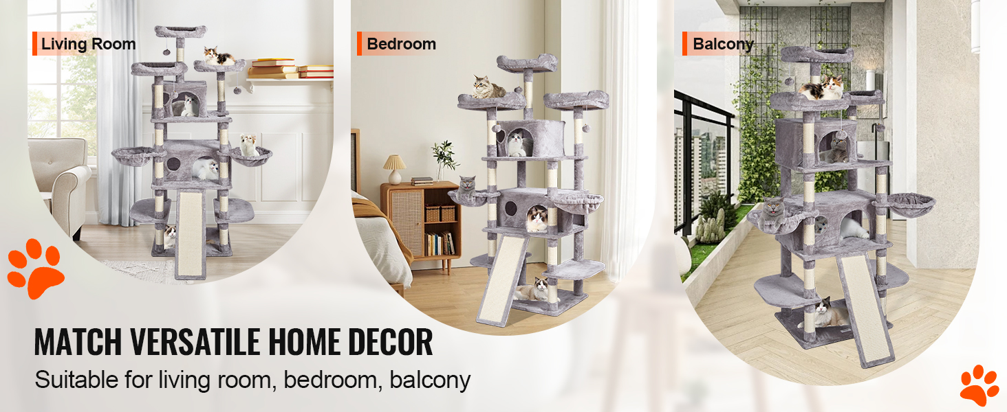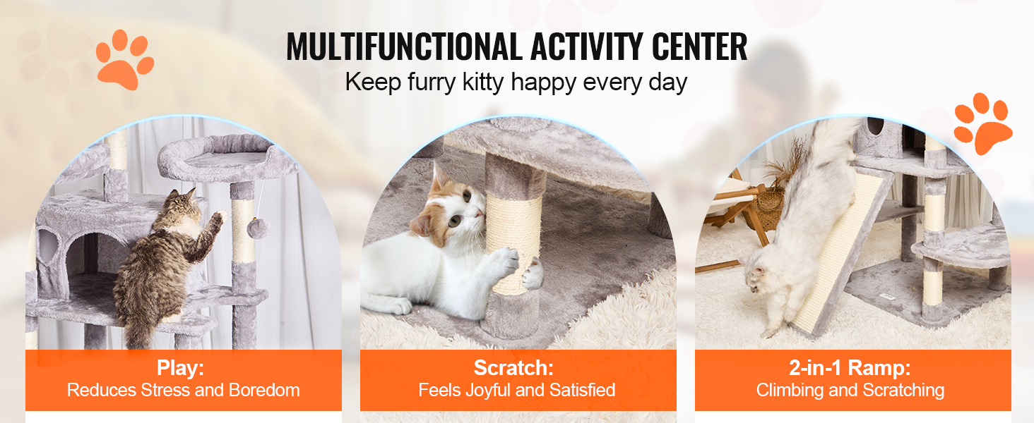 Vďaka visiacim hračkám a sisalovým škrabadlám sa mačky môžu voľne hrať, čo znižuje stres a nudu a zároveň udržiava zdravé pazúry. Rampa poskytuje zábavu pri šplhaní aj škrabaní. Viaceré plošiny ponúkajú zábavu pri šplhaní, čím pomáhajú mačkám zostať aktívne a plné života.