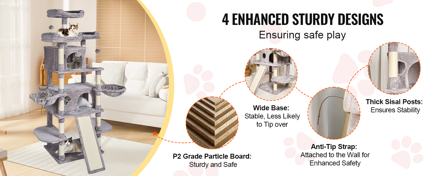 Bezpečnosť je našou prioritou. Tento strom na škrabanie pre mačky je vyrobený z drevotrieskových dosiek triedy P2, ktoré zaručujú odolnosť bez zápachu. Veľká základňa a zosilnené sisalové stĺpiky ešte viac zvyšujú stabilitu. Pásy proti prevráteniu sa dajú pripevniť na stenu pre väčšiu bezpečnosť.