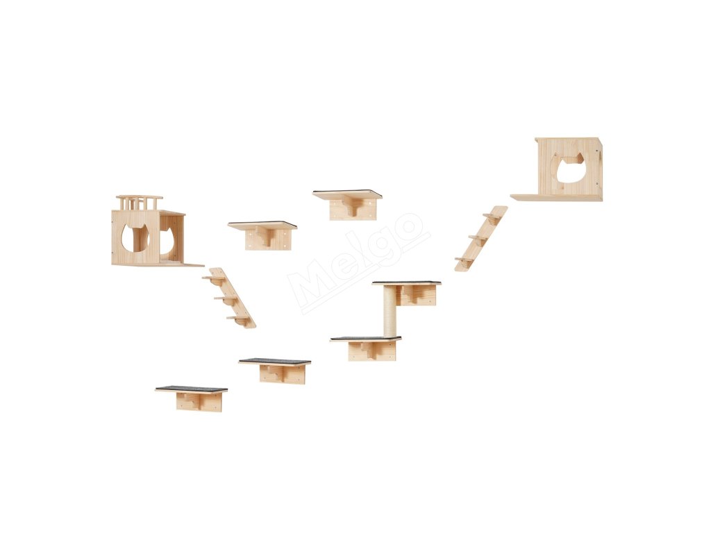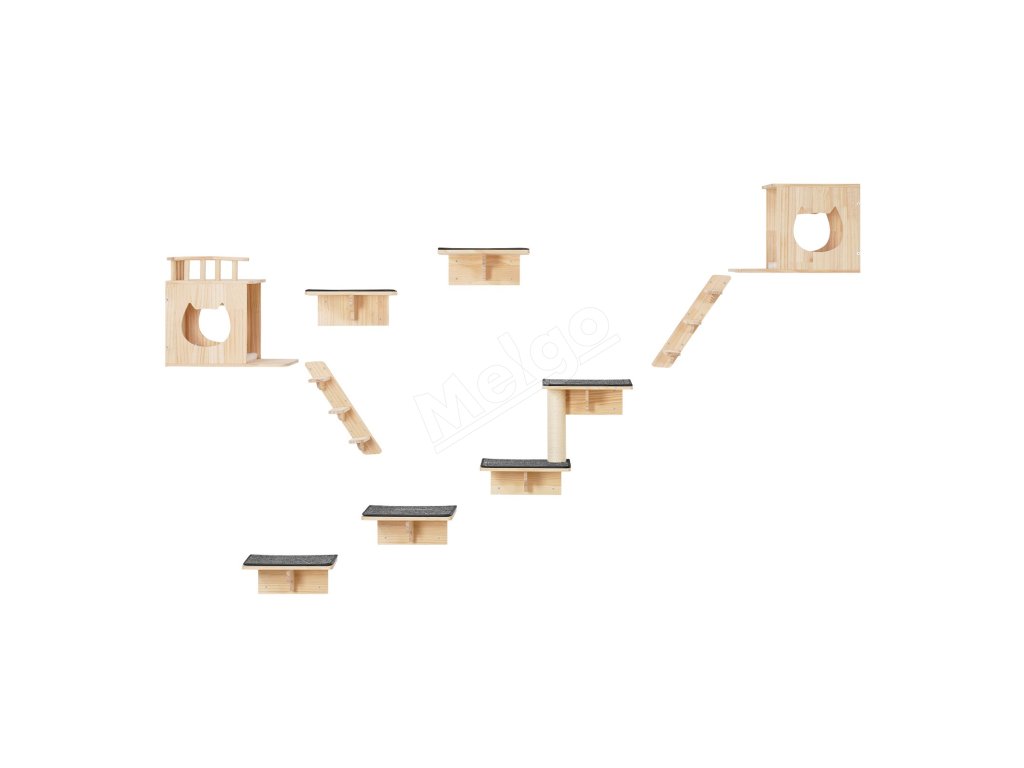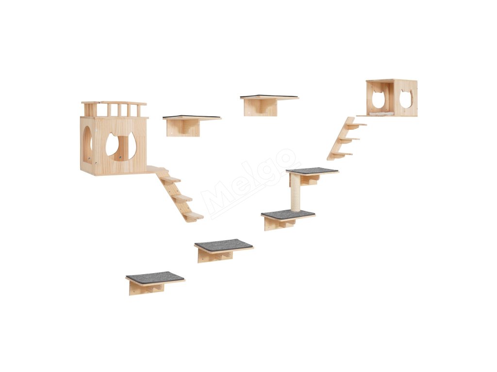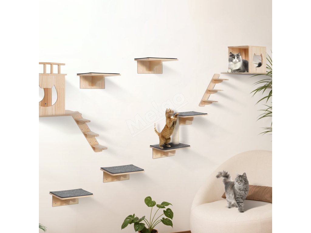 Naša nástenná polica pre mačky obsahuje 4 skákacie dosky, 2 hniezda pre mačky, 2 hojdacie siete a 1 strom pre mačky, ktoré spĺňajú rôzne potreby na šplhanie, zábavu, odpočinok a škrabanie a obohacujú hru vašej mačky.