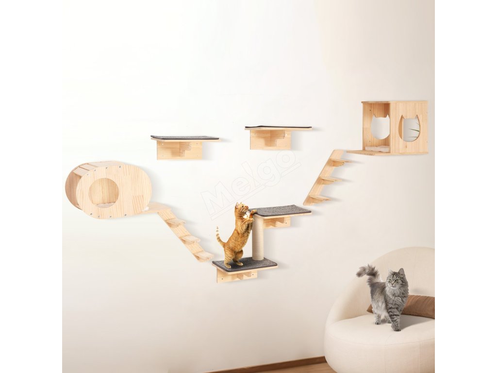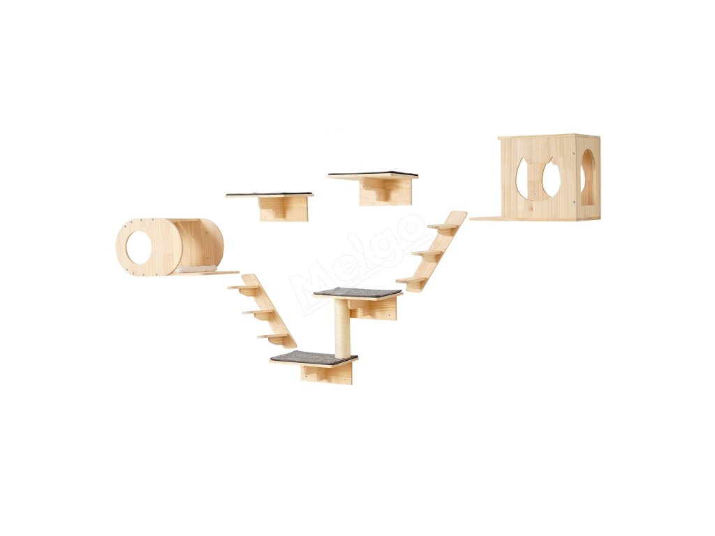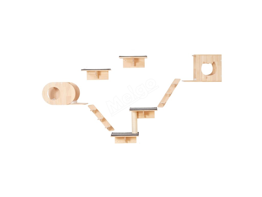 Naša nástenná polica pre mačky obsahuje 2 skákacie dosky, 2 hniezda pre mačky, 2 hojdacie siete a 1 strom pre mačky, ktoré spĺňajú rôzne potreby na šplhanie, zábavu, odpočinok a škrabanie a obohacujú hru vašej mačky.