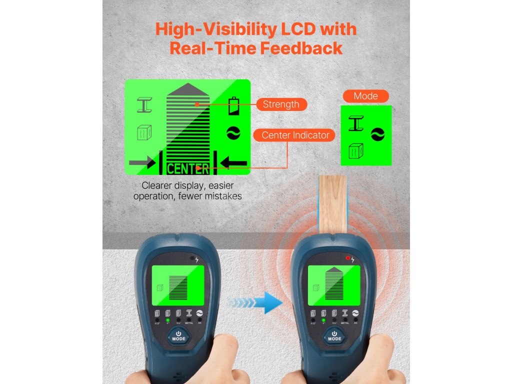 Detektor klincov je vybavený podsvieteným LCD displejom s vysokým rozlíšením a zvukovými upozorneniami, ktoré poskytujú jasnú vizuálnu spätnú väzbu počas procesu skenovania. To zvyšuje efektivitu a znižuje riziko chýb spôsobených neúplnými informáciami, na rozdiel od tradičných detektorov.