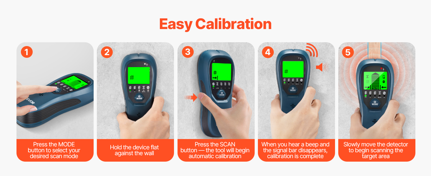 Vyhľadávač drevených svorníkov je vybavený inteligentným kalibračným systémom. Po zapnutí stačí stlačiť tlačidlo MODE a prístroj sa automaticky nakalibruje. Dokonca aj začínajúci používatelia sa môžu ľahko prispôsobiť a bez problémov zvládnu náročné prostredia, ako sú zmiešané materiály alebo duté steny.