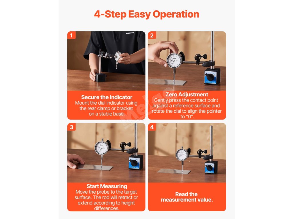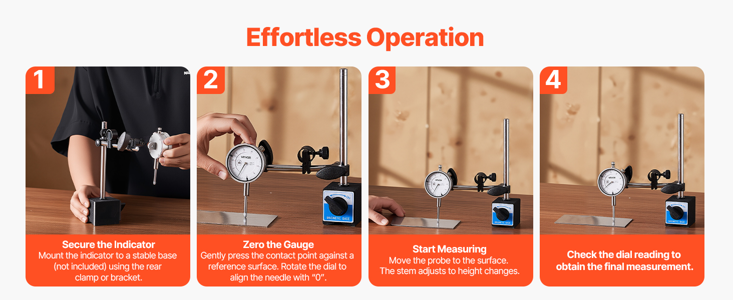 Od montáže a upevnenia základne až po vynulovanie, meranie a odčítanie si tento strojársky číselníkový indikátor vyžaduje len štyri kroky. Technici aj domáci majstri si ho rýchlo osvoja, aby mohli efektívne, stabilne a presne merať.