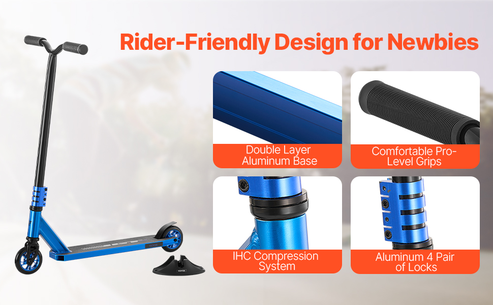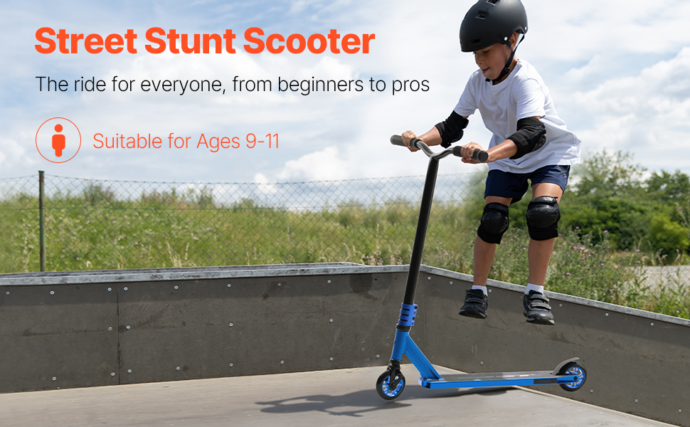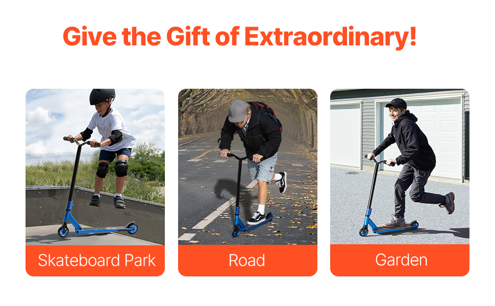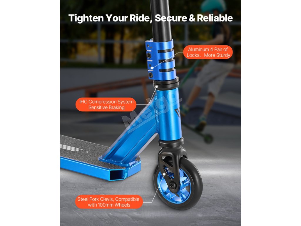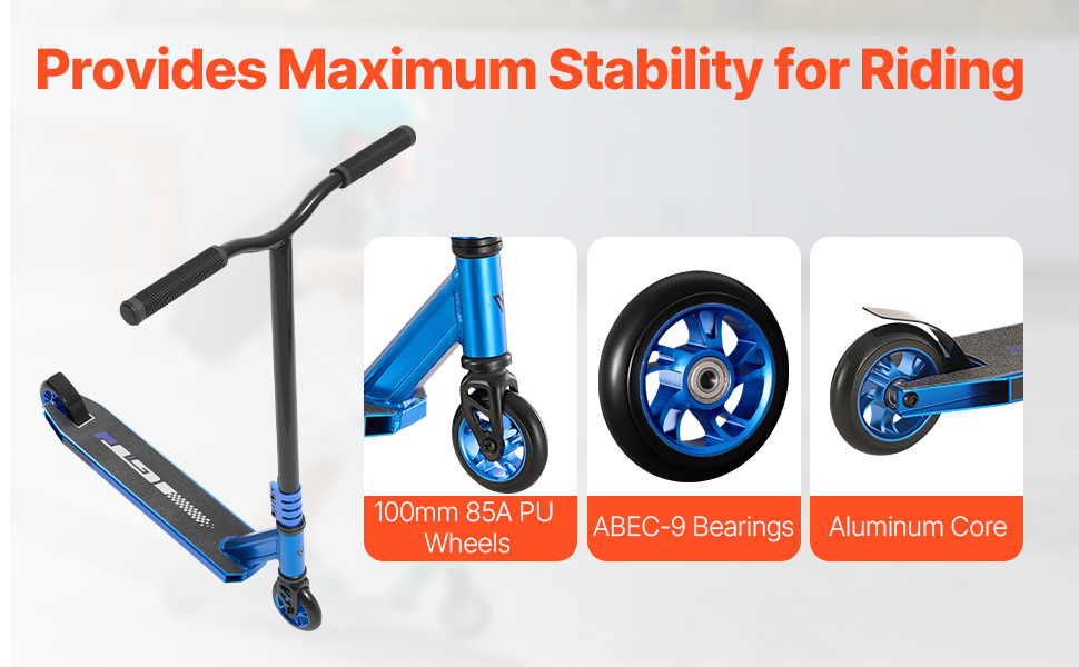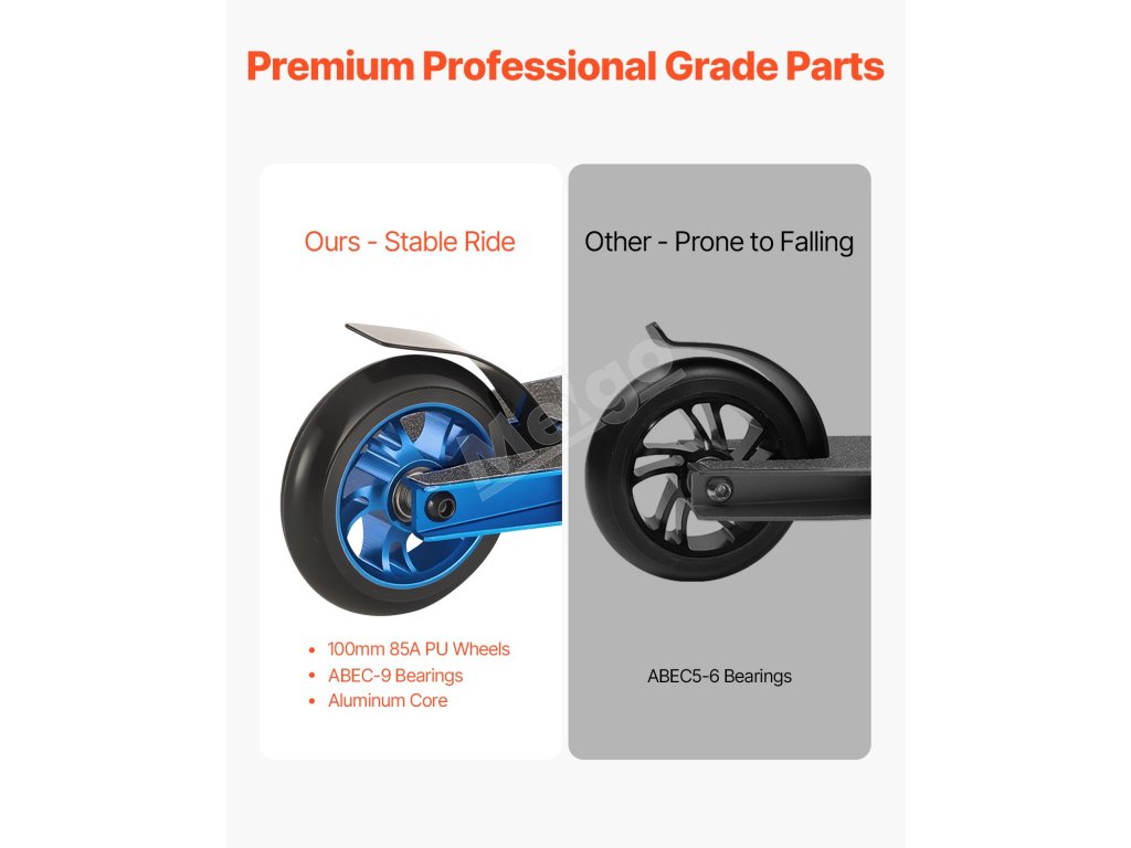 Stredne pokročilá kaskadérska kolobežka pre začiatočníkov je vybavená zosilnenou vidlicou so závitom z oceľovej zliatiny, ktorá je vybavená tichými 100 mm PU kolieskami, poskytujúcimi plynulú jazdu. Vďaka modernizovaným vysokorýchlostným guličkovým ložiskám ABEC-9 je vhodná na rýchlu jazdu.