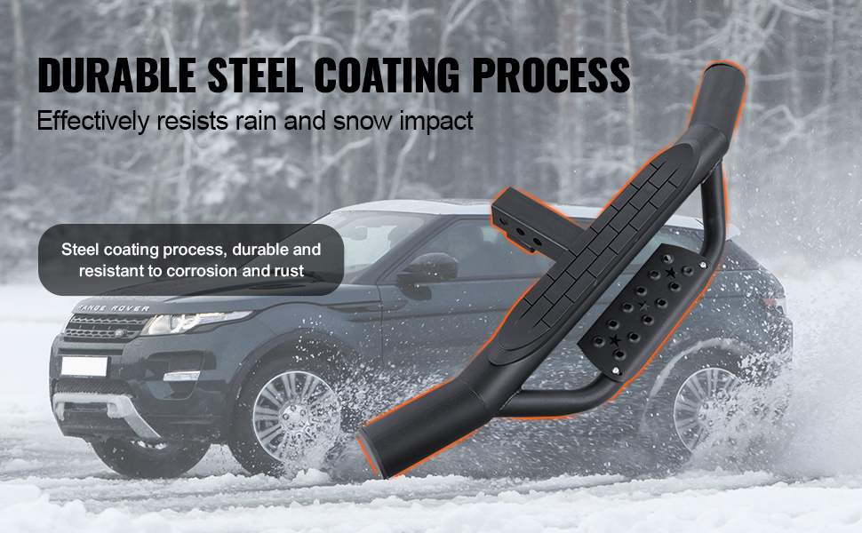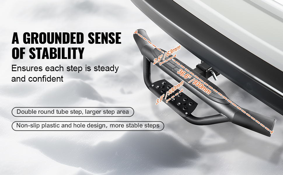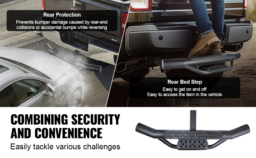 Náš závesný schodík slúži ako robustná ochranná bariéra zadnej časti vozidla, ktorá pohlcuje väčšinu nárazov, čím tlmí nárazy vášho vozidla a znižuje riziko vážnejších zranení vás a vašich cestujúcich. Funguje aj ako spoľahlivá opora pri stúpaní, vďaka čomu si môžete bez obáv vychutnať každú cestu.