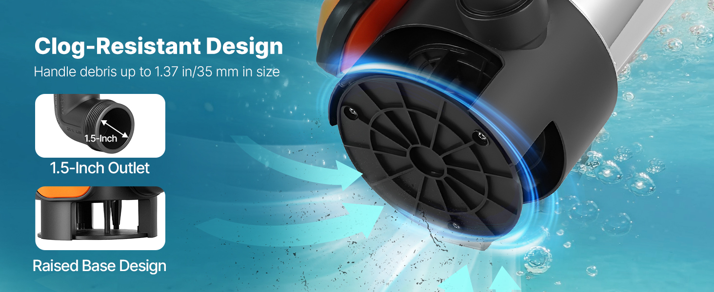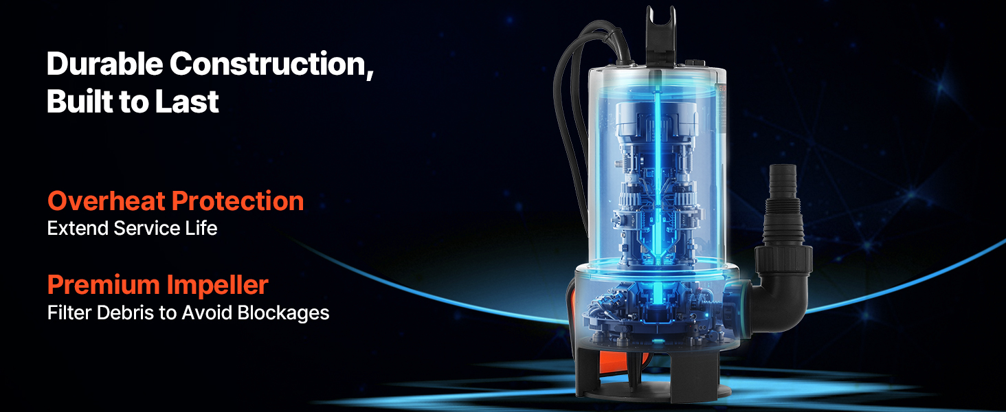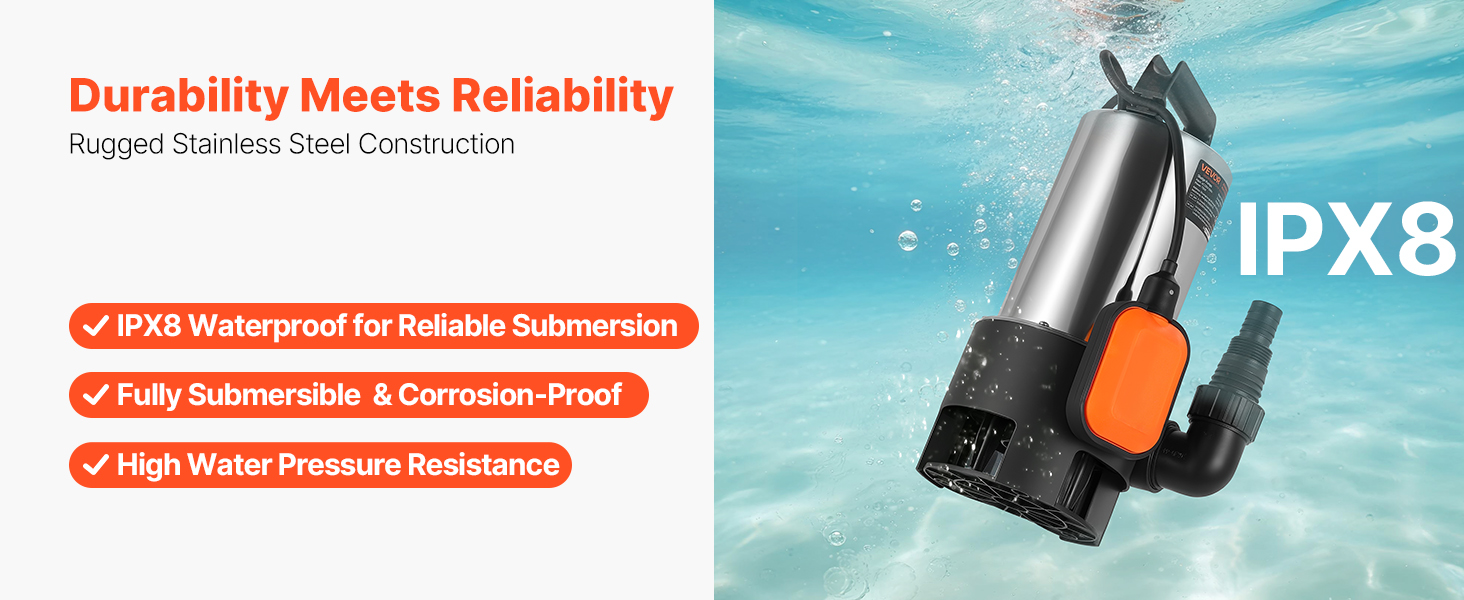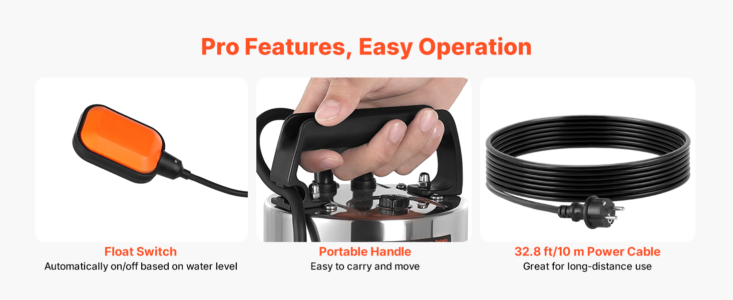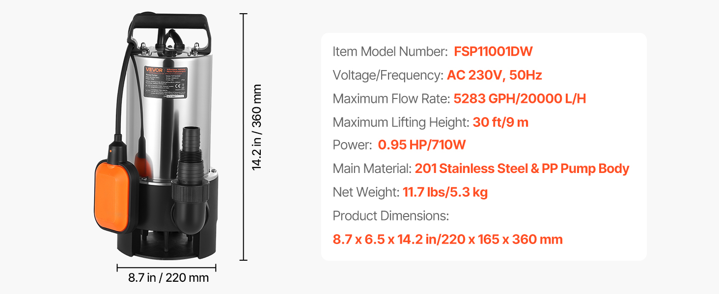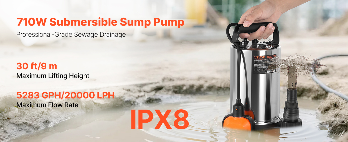 Toto 710W (0,95 HP) kalové čerpadlo poskytuje maximálny prietok 20 000 l/h (5283 GPH) a maximálny výtlak 30 stôp (9 m). Vďaka puzdru z nehrdzavejúcej ocele, vodotesnosti IPX8 a plavákovému spínaču zabezpečuje spoľahlivý ponorný výkon. Zvládne náročné odvodňovacie práce pre bazény, jazierka, záhrady atď.