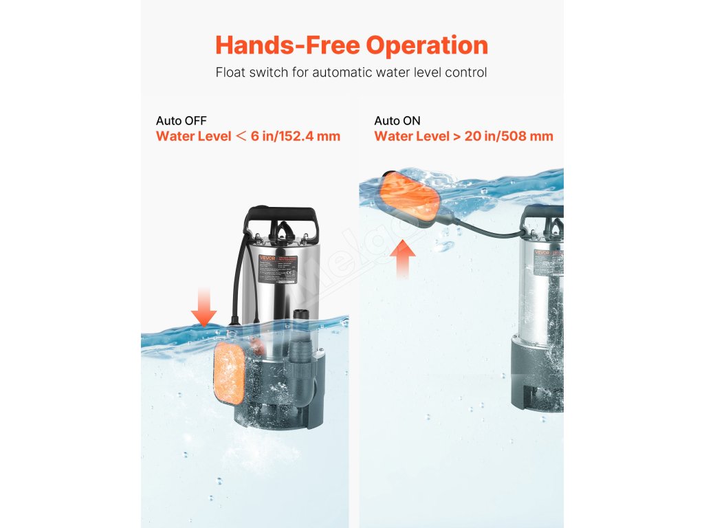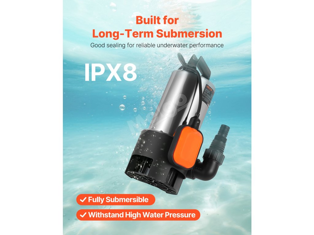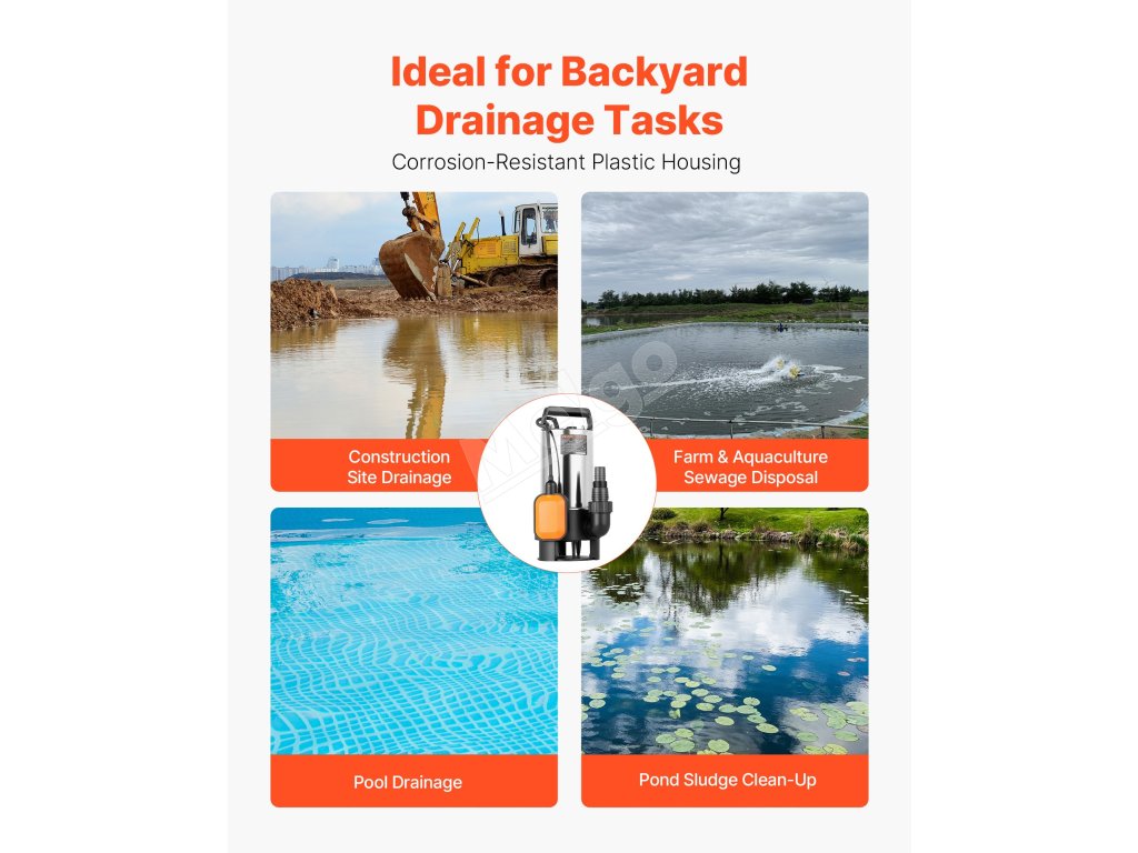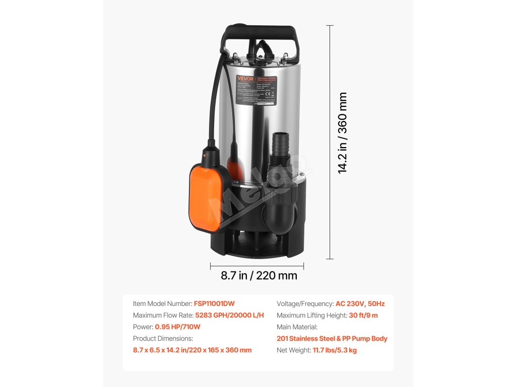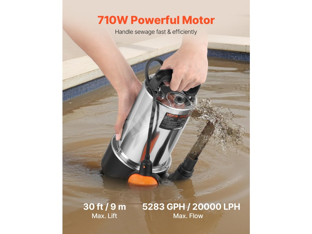 Toto 710W (0,95 HP) kalové čerpadlo poskytuje maximálny prietok 20 000 l/h (5283 GPH) a maximálny výtlak 30 stôp (9 m). Vďaka puzdru z nehrdzavejúcej ocele, vodotesnosti IPX8 a plavákovému spínaču zabezpečuje spoľahlivý ponorný výkon. Zvládne náročné odvodňovacie práce pre bazény, jazierka, záhrady atď.