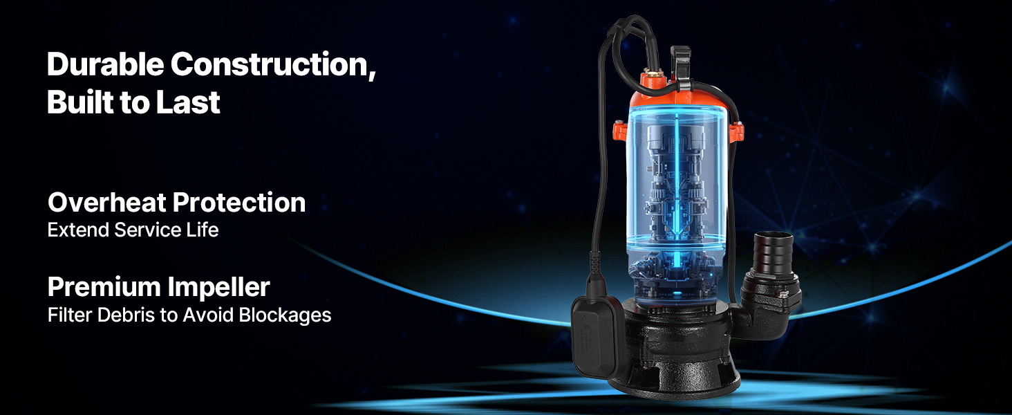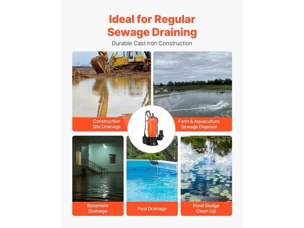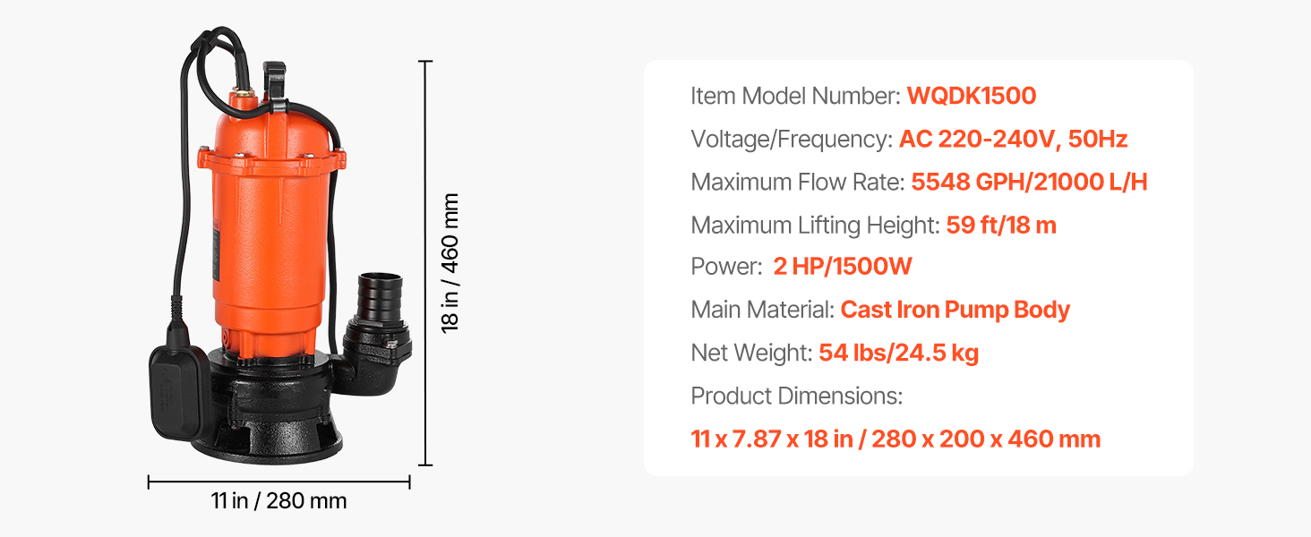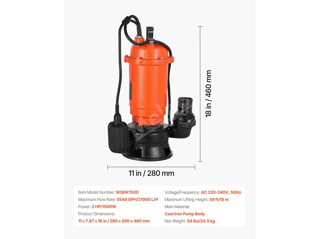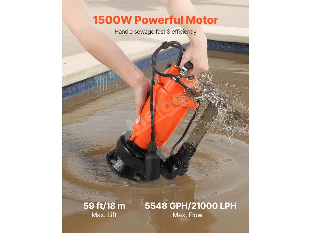 Toto 1500W (2 HP) kalové čerpadlo s maximálnym prietokom 21 000 l/h (5548 GPH) a maximálnym zdvihom 18 m (59 stôp) vám pomôže zvládnuť náročné práce spojené s odvádzaním odpadových vôd. Liatinové puzdro a vodotesnosť IPX8 pre spoľahlivý ponorný výkon. Ideálne na vypúšťanie bazénov, rybníkov, fariem atď.