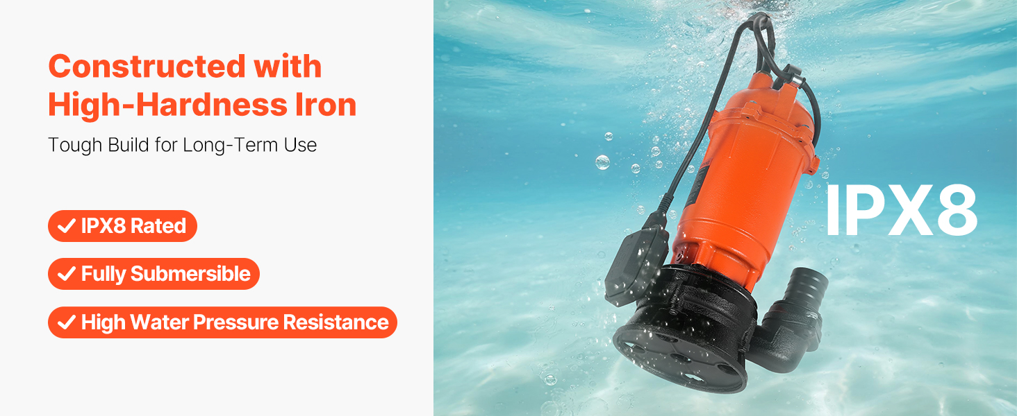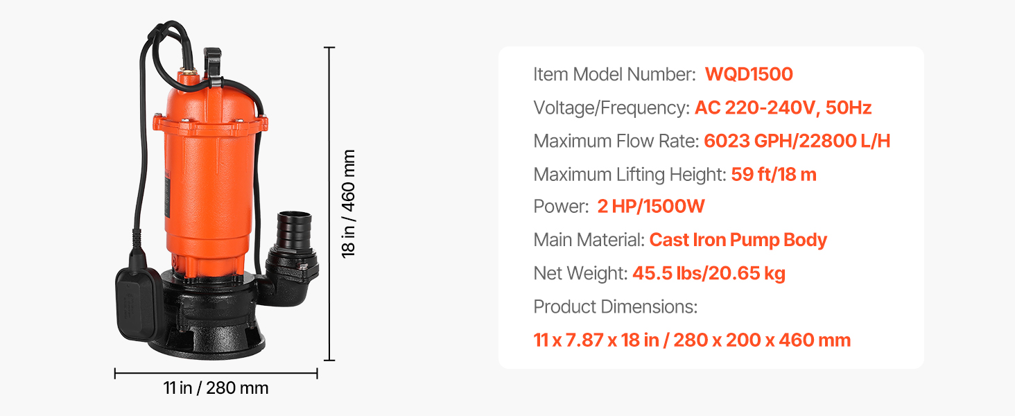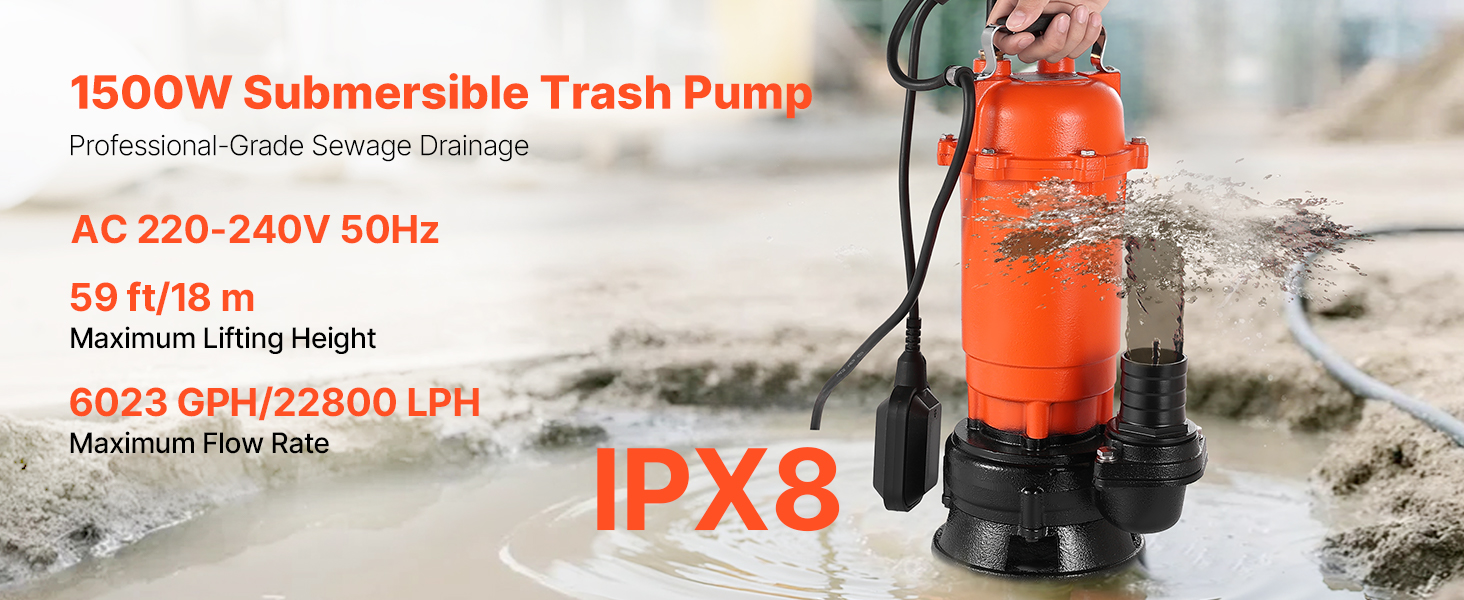 Toto 1500W (2 HP) kalové čerpadlo s maximálnym prietokom 22 800 l/h (6023 GPH) a maximálnym výtlakom 18 m (59 stôp) vám pomôže zvládnuť náročné úlohy spojené s odvádzaním odpadových vôd. Liatinové puzdro a vodotesnosť IPX8 pre spoľahlivý ponorný výkon. Ideálne na vypúšťanie bazénov, rybníkov, fariem atď.