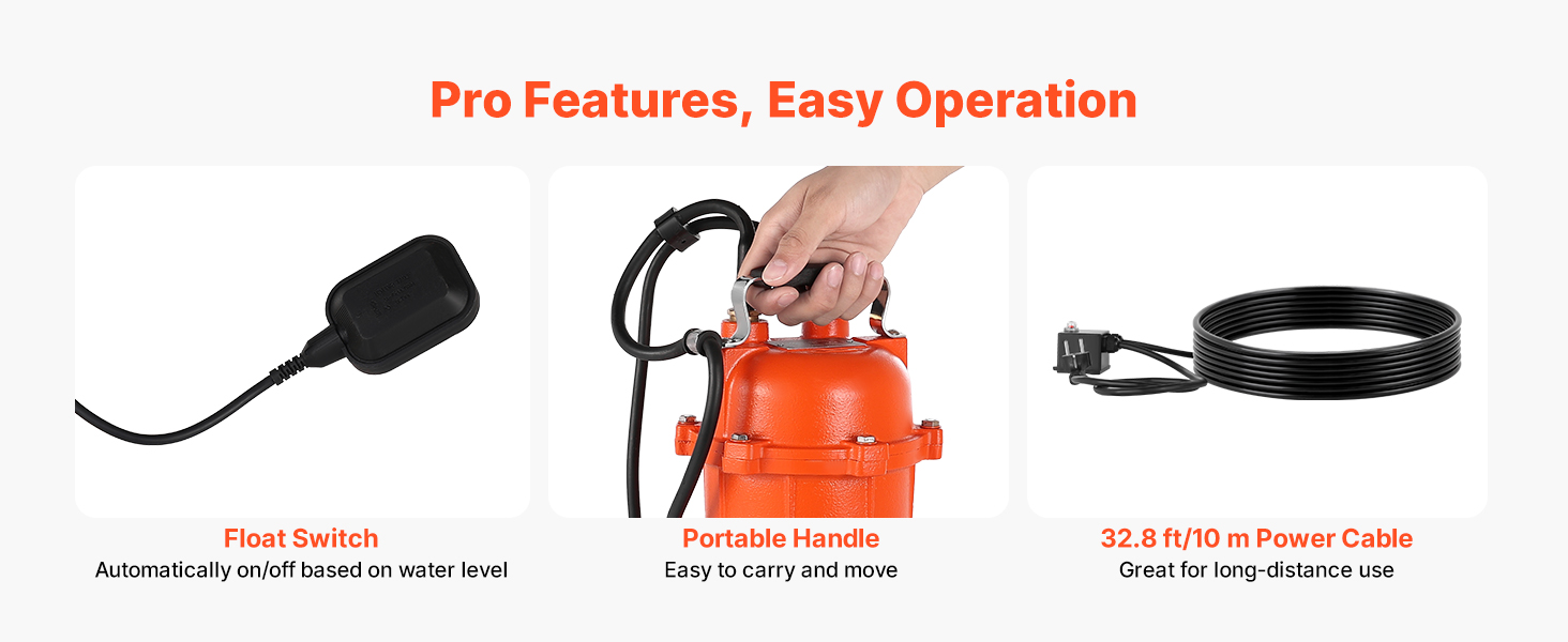 Plavákový spínač automaticky zapína/vypína toto ponorné kalové čerpadlo na základe hladiny vody bez nutnosti neustáleho monitorovania. Prenosná rukoväť uľahčuje prepravu, zatiaľ čo dlhý napájací kábel poskytuje flexibilné umiestnenie na bezproblémové odvádzanie znečistenej vody.