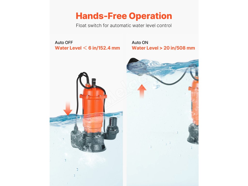 Plavákový spínač automaticky zapína/vypína toto ponorné kalové čerpadlo na základe hladiny vody bez nutnosti neustáleho monitorovania. Prenosná rukoväť uľahčuje prepravu, zatiaľ čo dlhý napájací kábel poskytuje flexibilné umiestnenie na bezproblémové odvádzanie znečistenej vody.