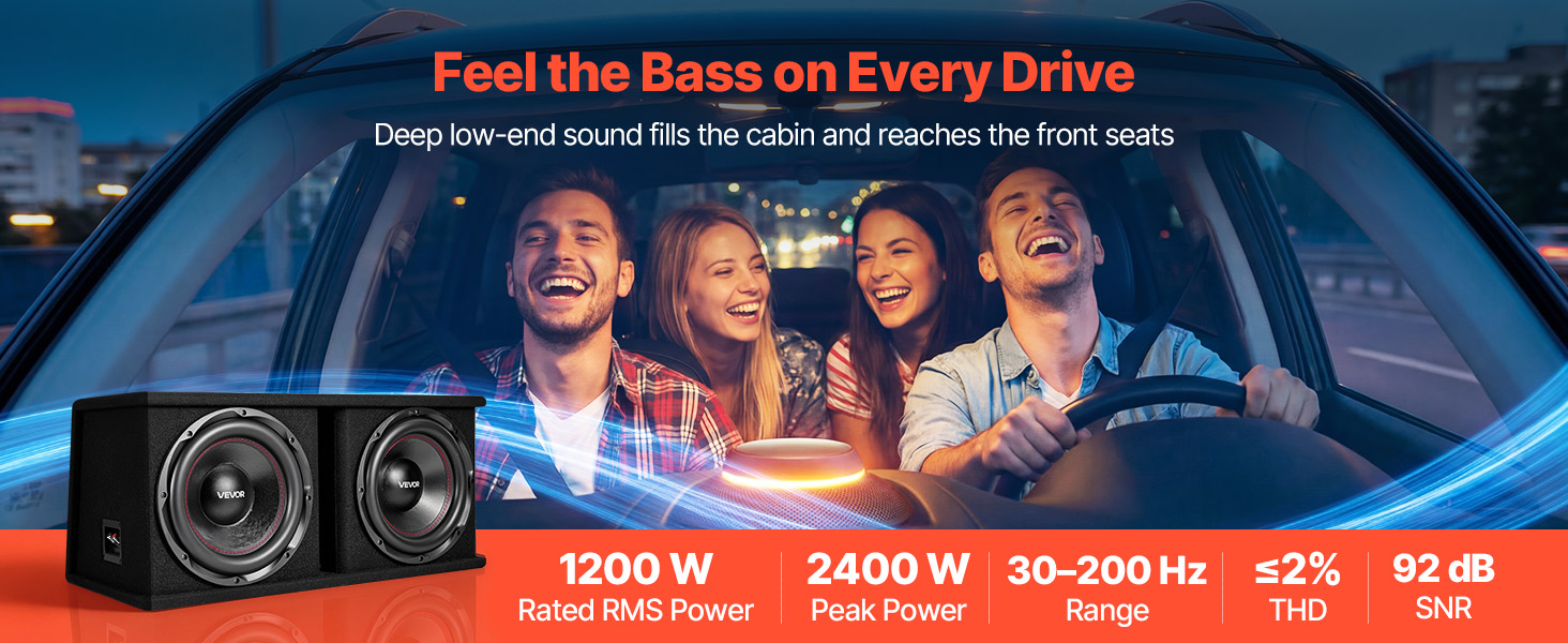 S výkonom až 1200 W RMS poskytuje táto súprava subwooferov a zosilňovačov silný basový zvuk v rozsahu 30–200 Hz, čím vytvára plný a pohlcujúci zvukový zážitok v kabíne.