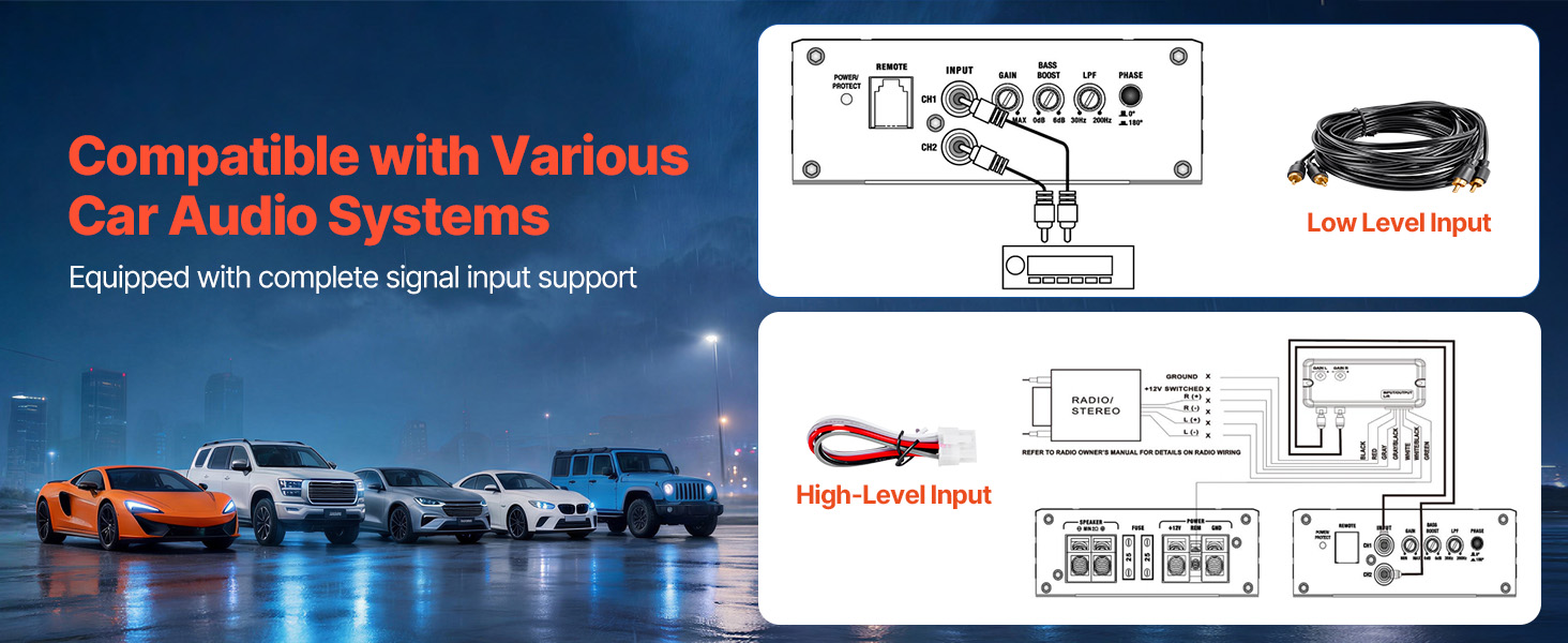 Naša kombinácia zosilňovača a subwoofera funguje s rôznymi vozidlami, vrátane sedanov, SUV a nákladných vozidiel. Široký rozsah vstupného napätia a priložený adaptér z vysokého na nízke napätie podporujú ako hlavné jednotky vybavené konektormi RCA, tak aj základné továrenské autorádiá.