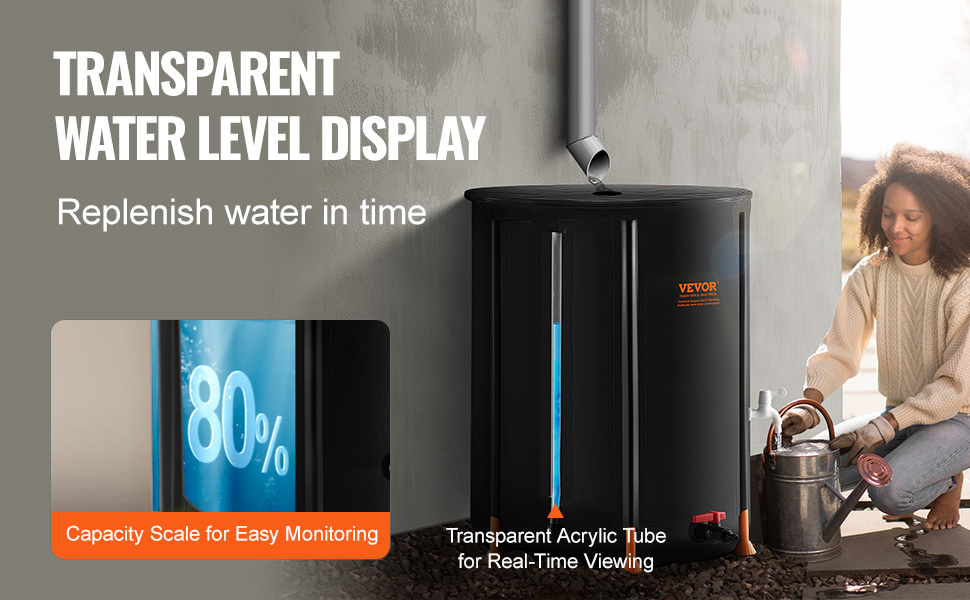 Akrylová priehľadná trubica umožňuje sledovať hladinu vody na prvý pohľad. Vďaka priehľadným líniám stupnice môžete v skladacom sude na dážď ľahko regulovať objem vody bez otvárania veka, čo vám zaručí, že budete mať vždy po ruke dostatok vody.