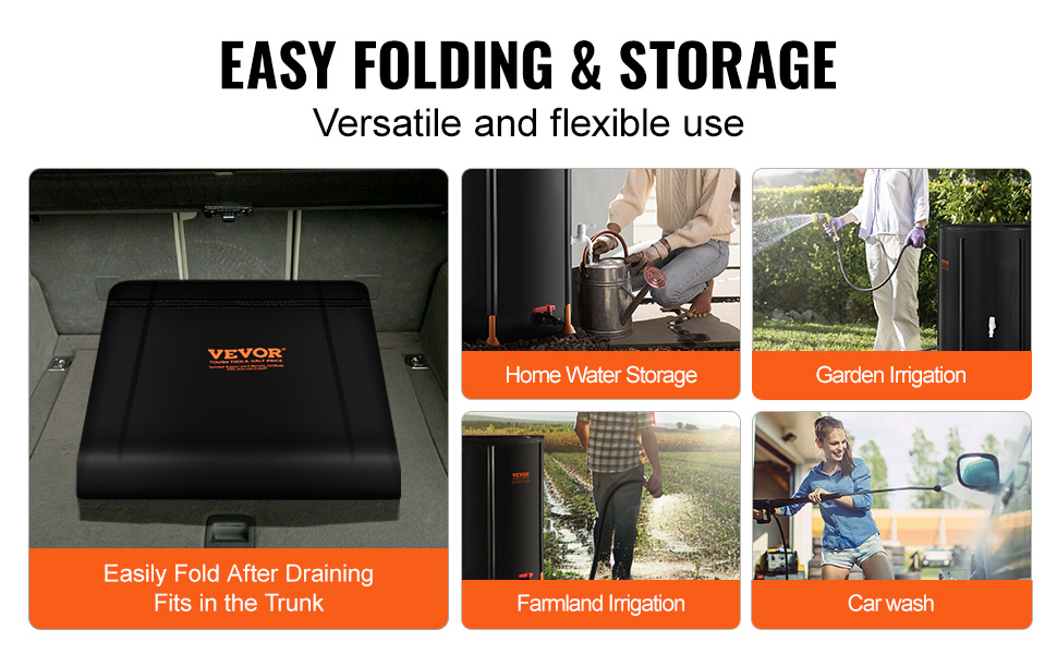 Po vypustení vody možno sud na zber dažďovej vody ľahko zložiť do kompaktných rozmerov na uskladnenie v stiesnených priestoroch, napríklad v kufri auta. Ideálny na skladovanie vody v domácnosti, zavlažovanie záhrady, poľnohospodárske použitie alebo núdzové zásobovanie vodou.