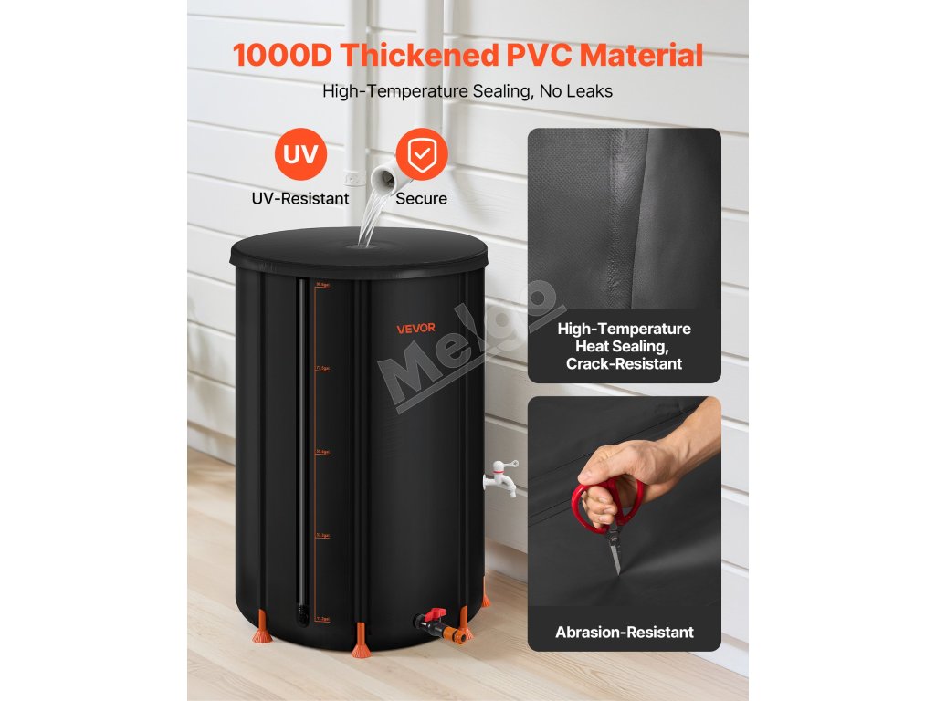 Tento prenosný sud na dážď je vyrobený z odolného PVC 1000D, je odolný voči dažďu, UV žiareniu, opotrebovaniu a bezpečný. Funguje pri teplotách od -30 ℃ do 70 ℃, takže je vhodný pre horúce letá aj chladné zimy.