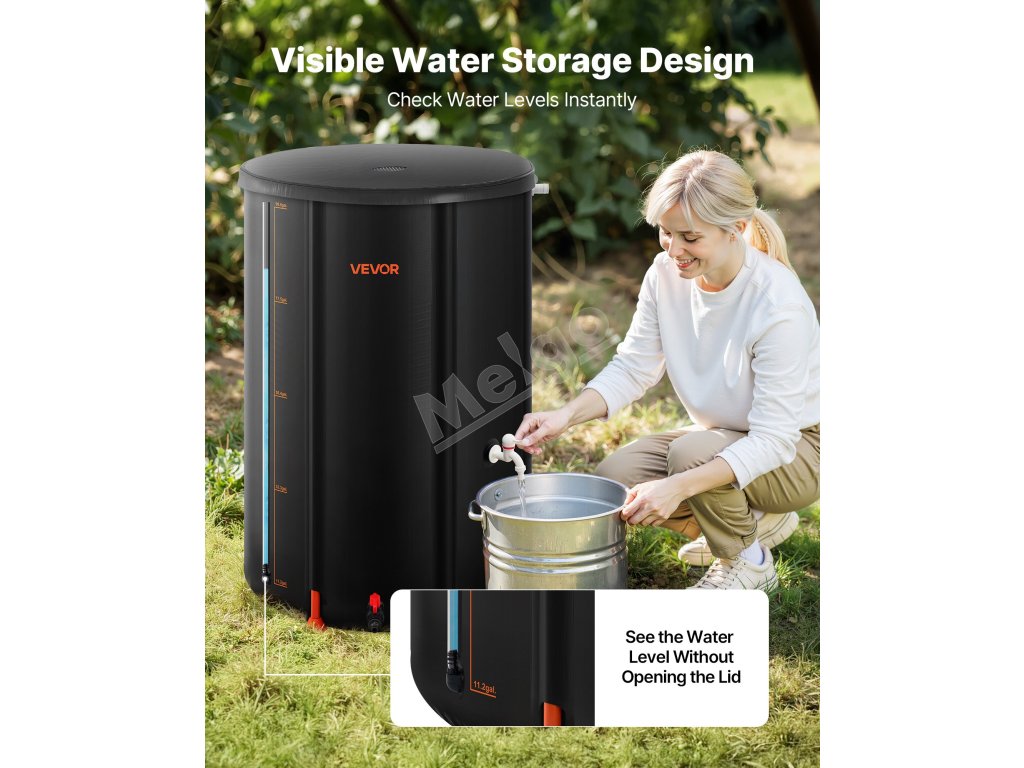 Akrylová priehľadná trubica umožňuje sledovať hladinu vody na prvý pohľad. Vďaka priehľadným líniám stupnice môžete v skladacom sude na dážď ľahko regulovať objem vody bez otvárania veka, čo vám zaručí, že budete mať vždy po ruke dostatok vody.