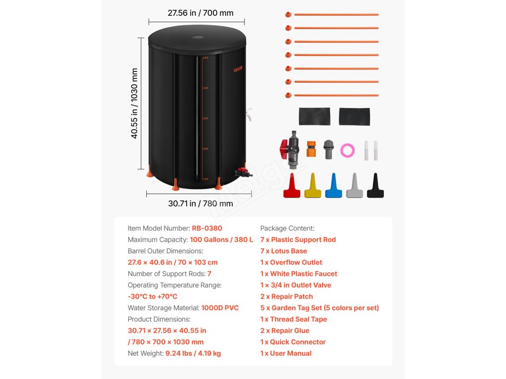 Tento skladací sud na dažďovú vodu s objemom 100 galónov poskytuje dostatok úložného priestoru na uspokojenie vašich potrieb počas sucha alebo obdobia dažďov. Jeho skladacia konštrukcia šetrí úložný priestor a uľahčuje jeho prepravu a nastavenie. Spoľahlivý zdroj vody na použitie v domácnosti a zavlažovanie záhrady!