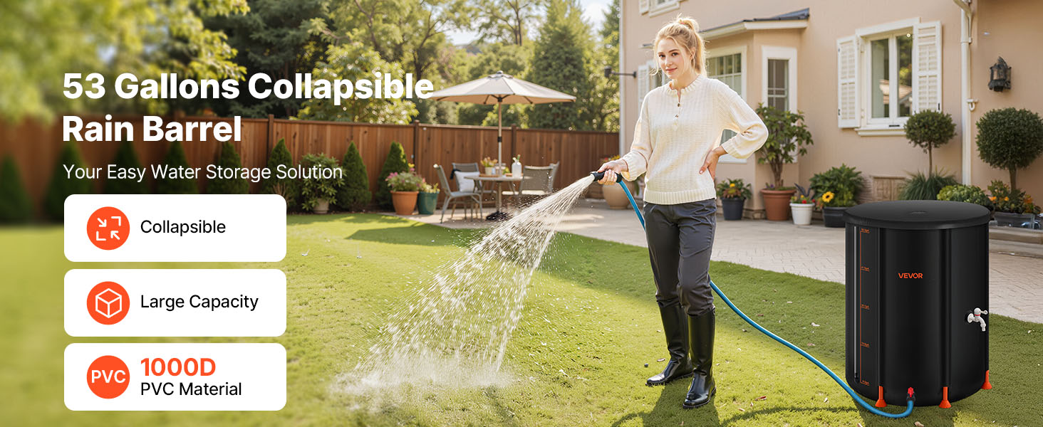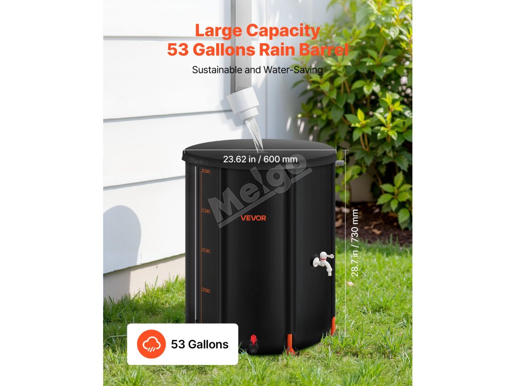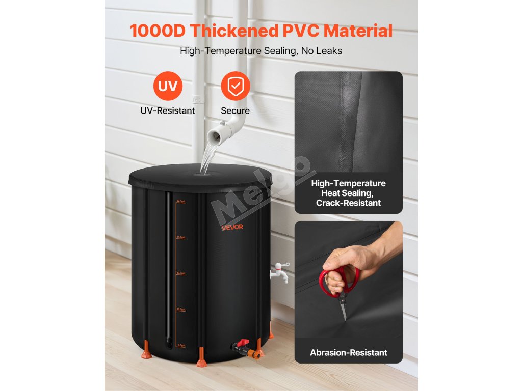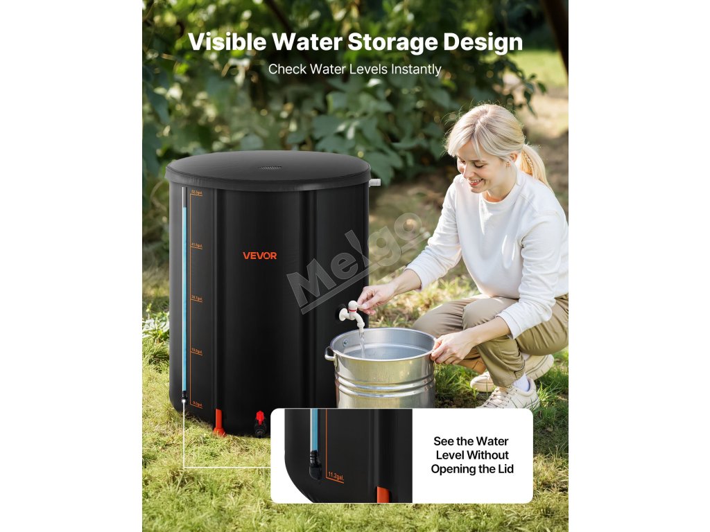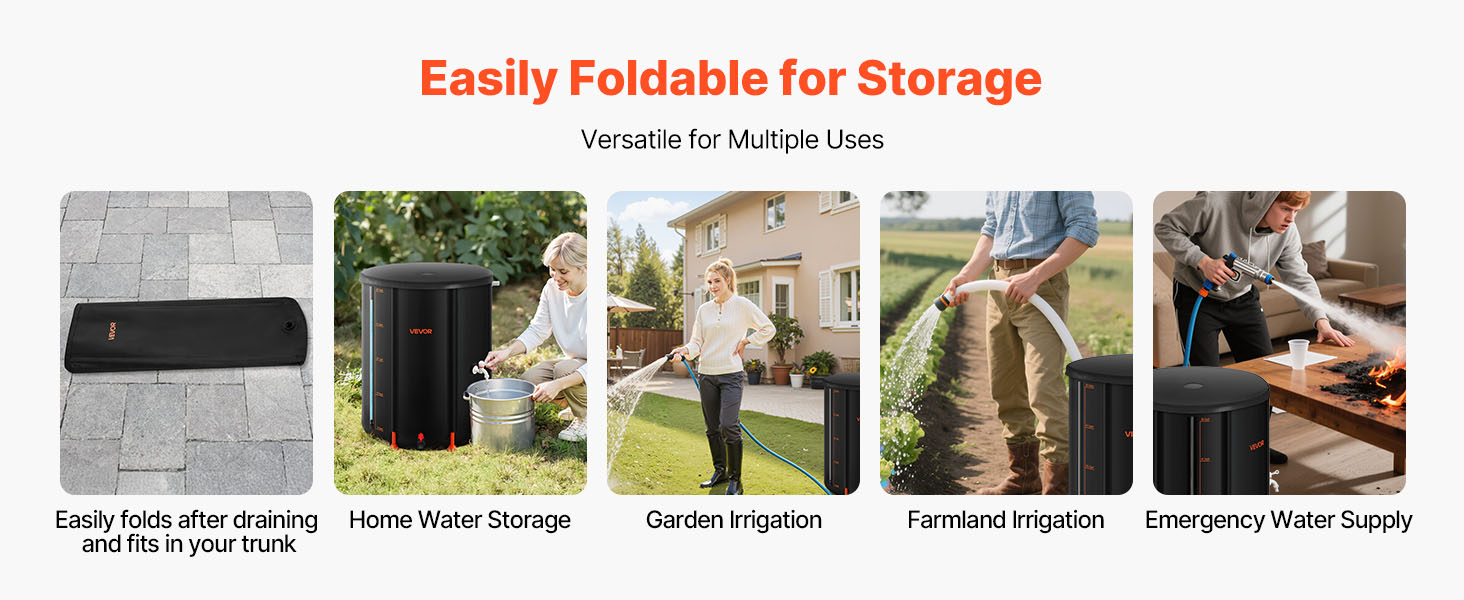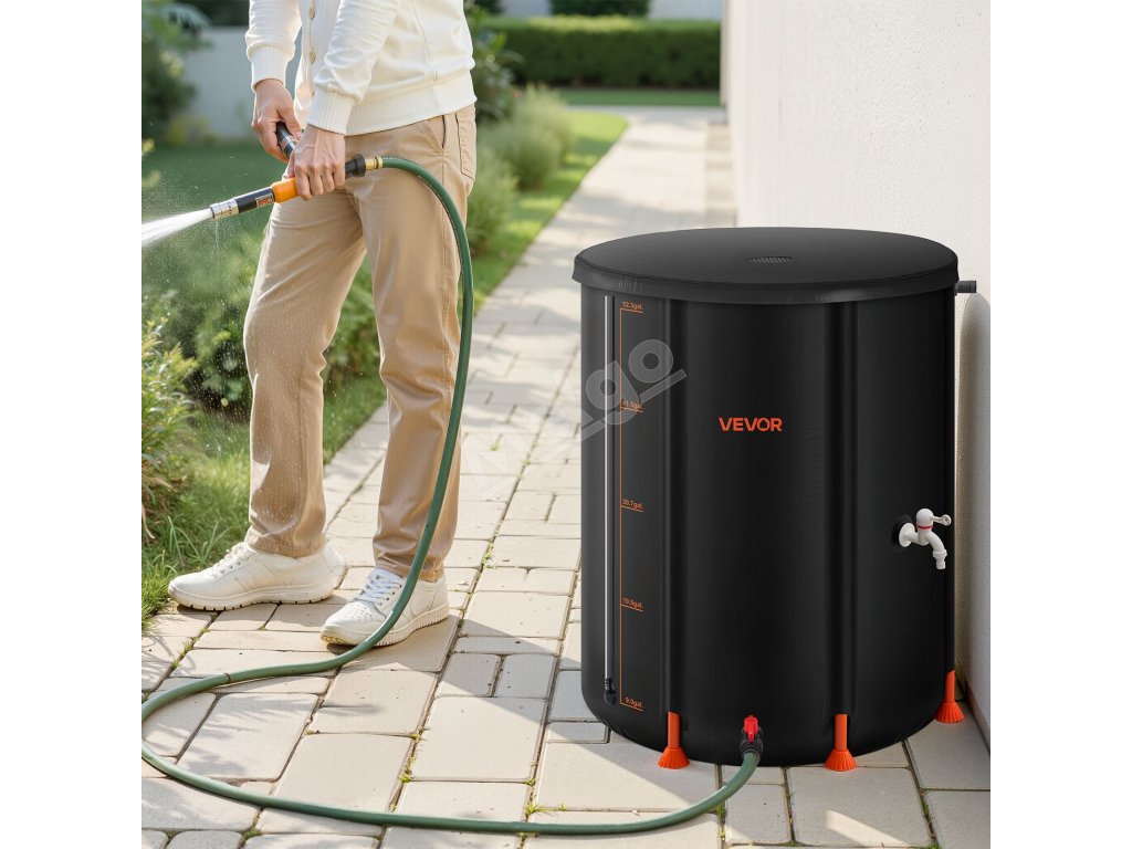 Po vypustení vody sa tento sud na dážď zloží do kompaktných rozmerov na uskladnenie v malých priestoroch, napríklad v kufri auta. Vďaka svojej všestrannosti je ideálny na skladovanie v domácnosti, zavlažovanie záhrady, polievanie poľnohospodárskej pôdy alebo ako núdzový zdroj vody.