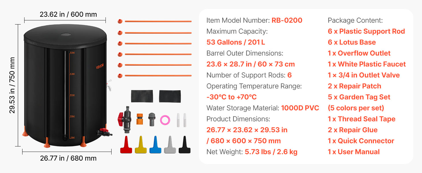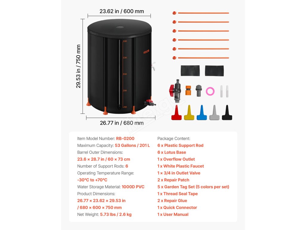 Náš skladací sud na dážď vyrobený z PVC 1000D ponúka odolnosť a pohodlie. Je vybavený lotosovou základňou, 2 mm podpornými tyčami, sieťovaným vrchom, predinštalovaným vývodom, akrylovým meradlom a rýchlym nastavením. Dá sa zložiť na kompaktné uskladnenie a je ideálny na použitie v domácnosti, záhrade, na farme a v prípade núdze.