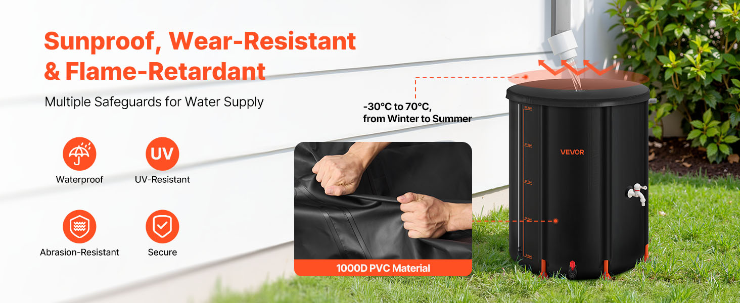 Tento skladací sud na vodu je vyrobený z PVC 1000D, ktoré ponúka vlastnosti odolné proti dažďu, UV žiareniu, opotrebovaniu a netoxické. Vďaka pracovnému teplotnému rozsahu od -30 ℃ do +70 ℃ spoľahlivo funguje v horúcom lete aj v mrazivej zime.