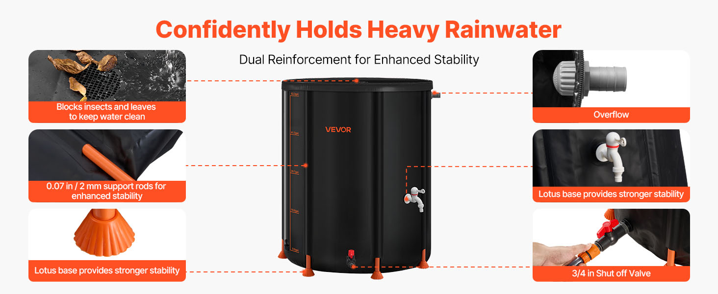 Zberač dažďovej vody využíva základňu v tvare lotosu, ktorá zabezpečuje stabilitu, a 2 mm hrubé podporné tyče, ktoré udržiavajú jeho tvar aj pri naplnení. Vrchná sieťka blokuje hmyz a lístie, zatiaľ čo 3/4-palcový rýchlouzáver a kohútik uľahčujú prístup k vode.