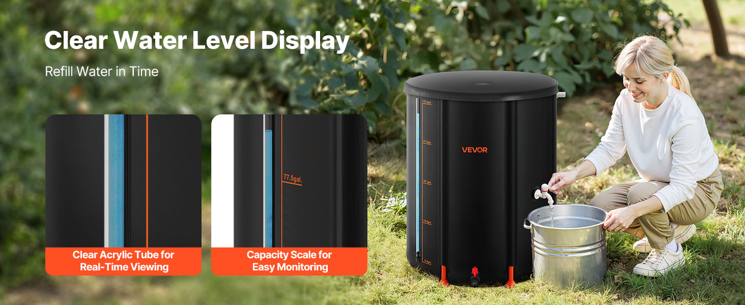 Náš systém na zber dažďovej vody je vybavený akrylovou priehľadnou trubicou s jasným označením, takže môžete kedykoľvek skontrolovať hladinu vody bez otvárania veka, včas ju doplniť a vyhnúť sa jej nedostatku, keď je voda najviac potrebná.