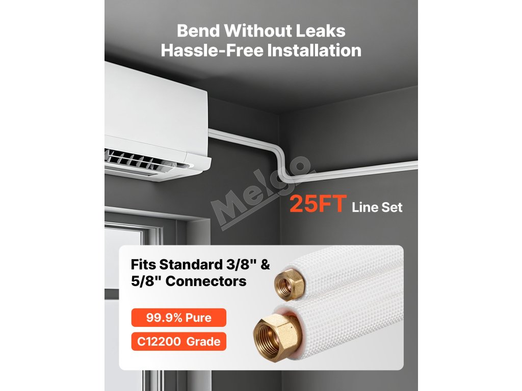 Súprava je kompatibilná s klimatizáciami mini-split. Vysokočisté rúrky sú odolné voči zalomeniu a netesnostiam, ideálne na inštaláciu v garáži alebo dielni. Obsahuje páskovaciu pásku a všetko príslušenstvo na okamžité použitie. Jednoduché nastavenie si vyžaduje len základné zručnosti s náradím na pripojenie vnútornej a vonkajšej jednotky.