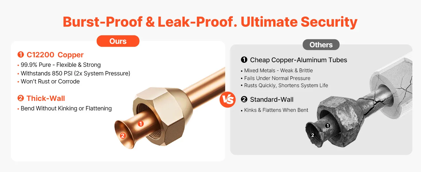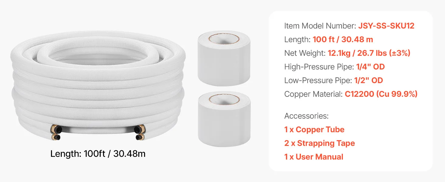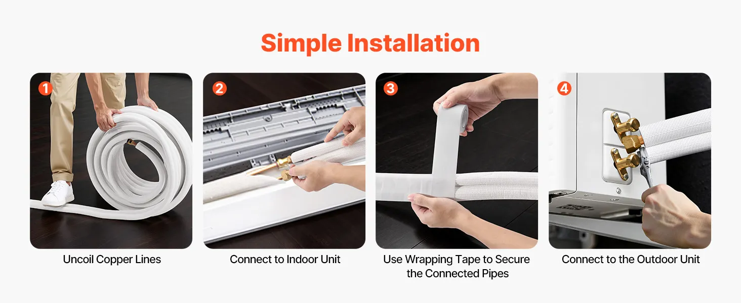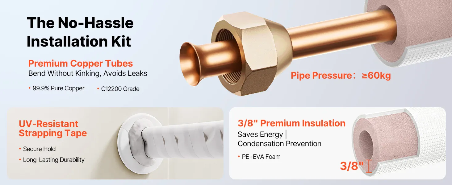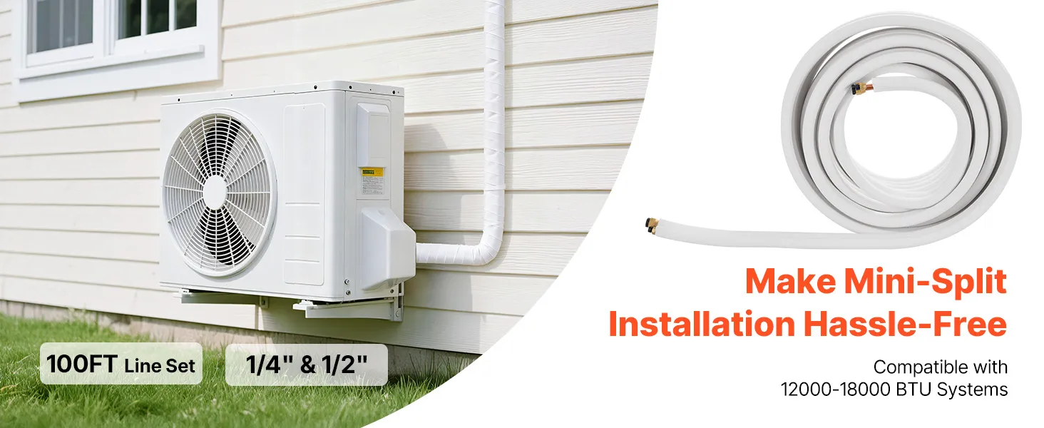 Súprava je kompatibilná s mini-split klimatizačnými jednotkami. Rúrky s vysokou čistotou odolávajú zalomeniu a netesnostiam pri ohyboch, čo je ideálne pre zložité zostavy, ako sú garáže alebo dielne. Dodáva sa s páskou - pripravená na použitie po vybalení z krabice. Jednoduchá inštalácia si vyžaduje len základné nástroje na pripojenie vnútorných a vonkajších jednotiek.