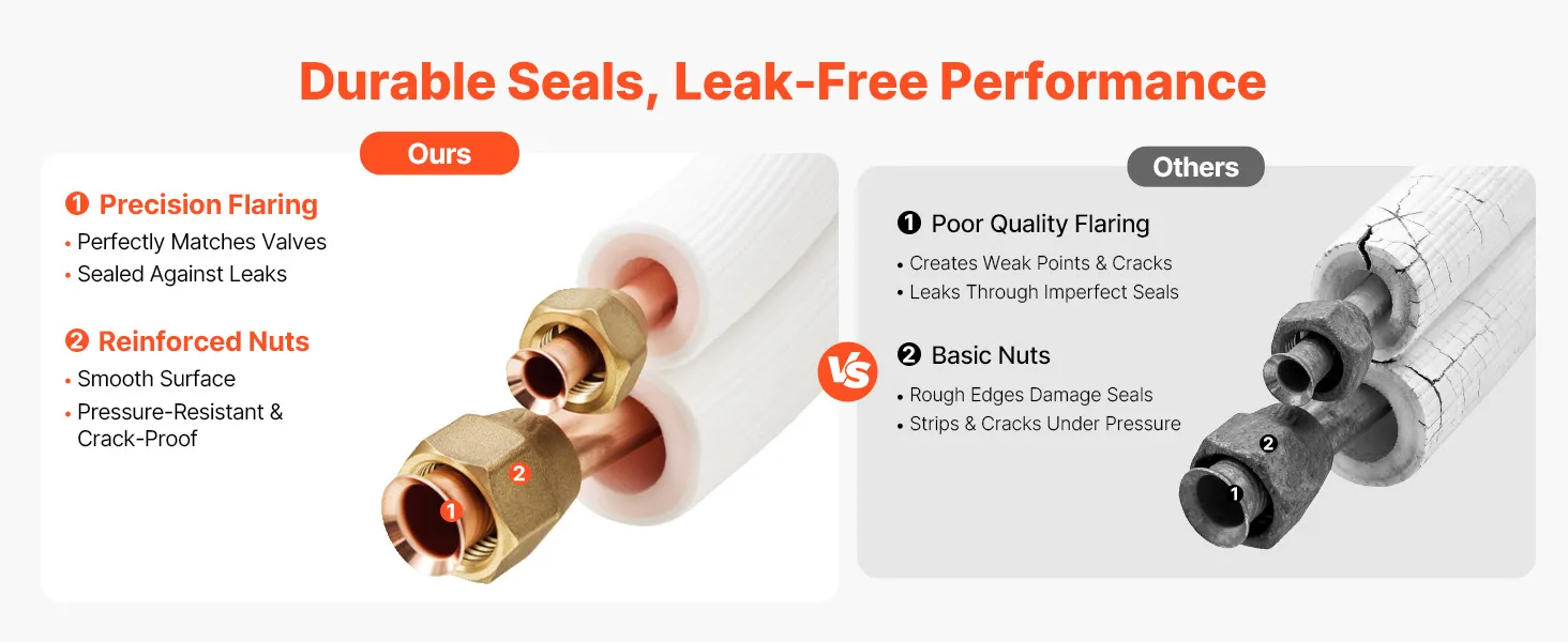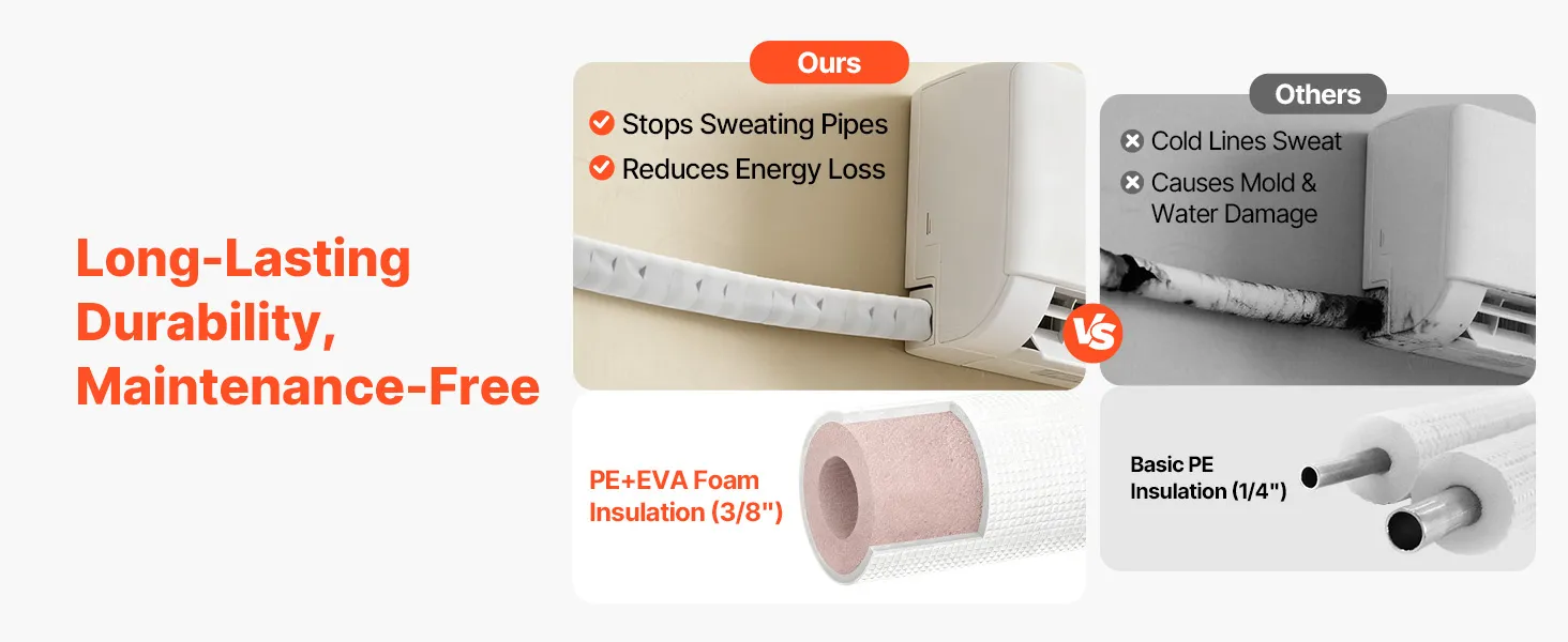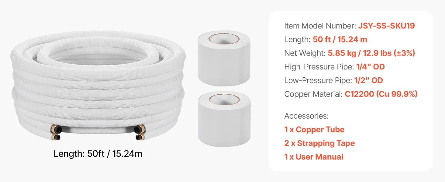 Súprava je kompatibilná s mini-split klimatizačnými jednotkami. Rúrky s vysokou čistotou odolávajú zalomeniu a netesnostiam pri ohyboch, čo je ideálne pre zložité zostavy, ako sú garáže alebo dielne. Dodáva sa s páskou - pripravená na použitie po vybalení z krabice. Jednoduchá inštalácia si vyžaduje len základné nástroje na pripojenie vnútorných a vonkajších jednotiek.