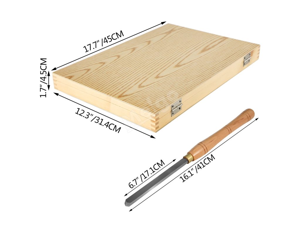 Uzatvárateľné drevené puzdro na jednoduché skladovanie a prepravu. Rozmery škatule (D x Š x V): 17,72" x 12,60" x 1,65" / 45 x 32 x 4,2 cm.
