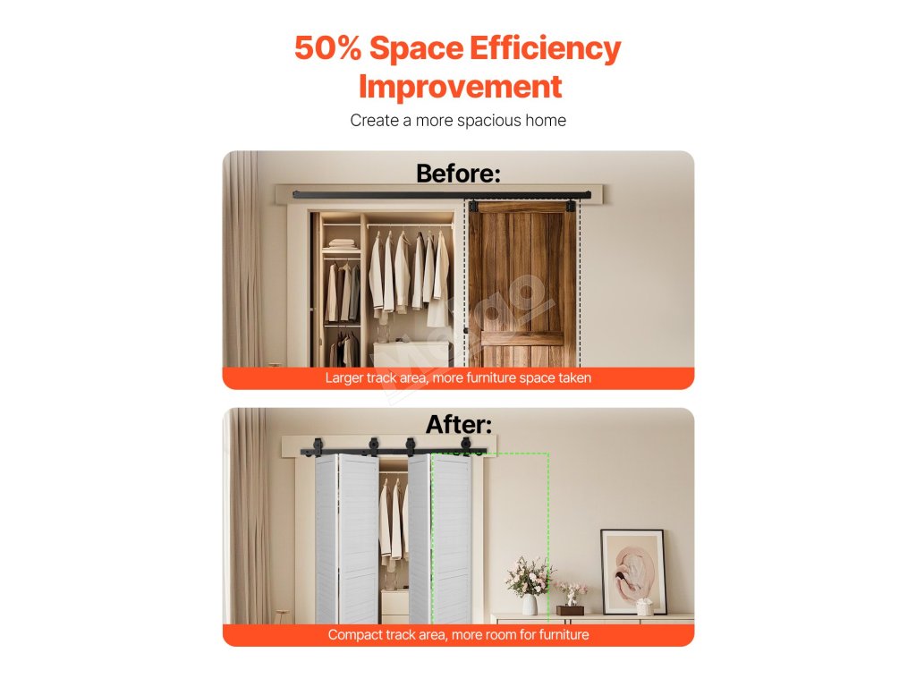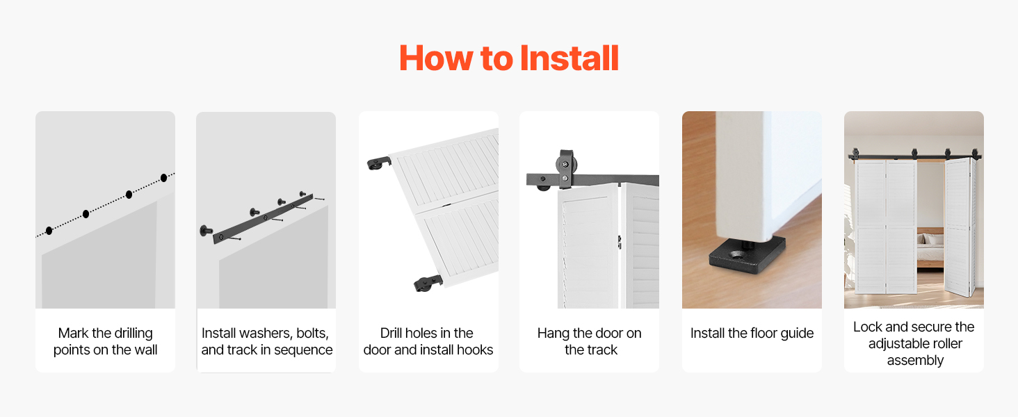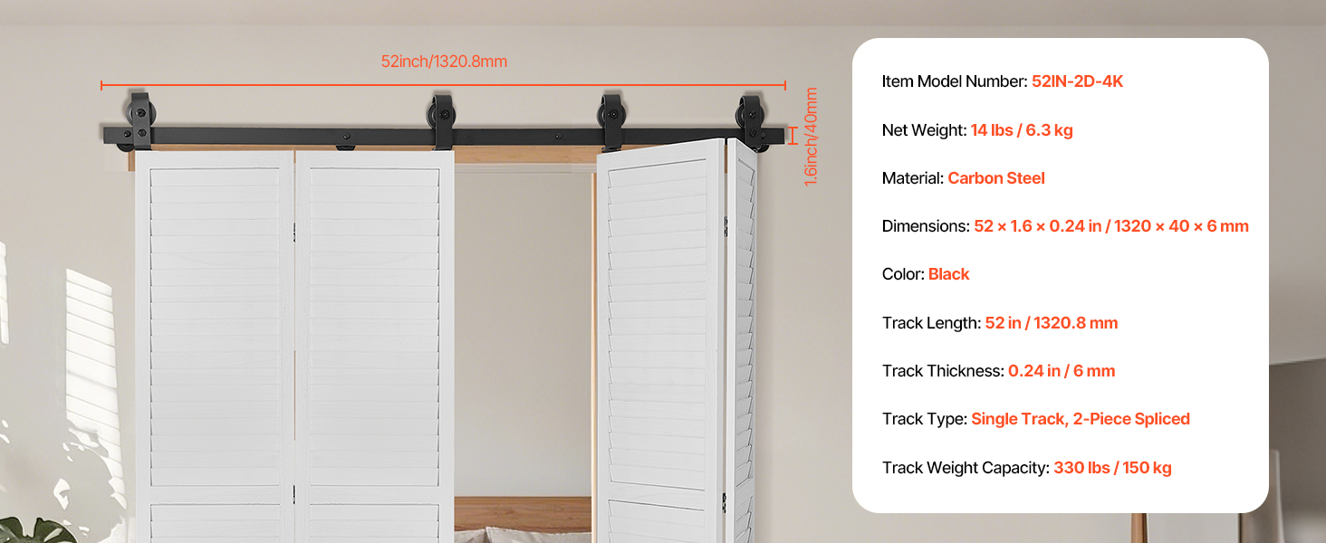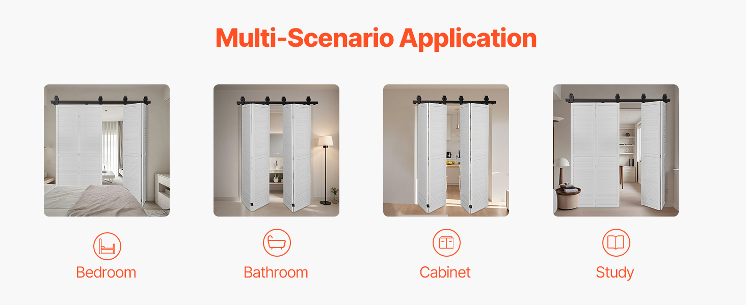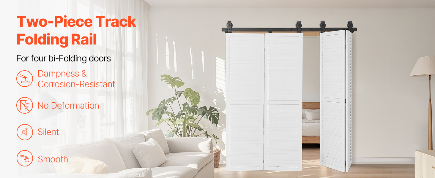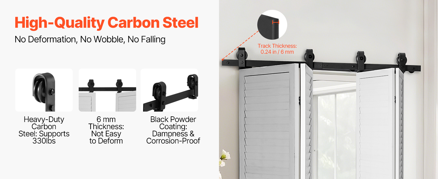Naša súprava hardvéru pre skladacie dvere je vyrobená z odolnej uhlíkovej ocele, ktorá unesie až 330 libier (150 kg). Tieto koľajnice pre dvojkrídlové šatníkové dvere majú skladací dizajn, ktorý maximalizuje priestor, a čierna prášková farba zaručuje odolnosť proti korózii vo vlhkých priestoroch, ako sú kuchyne a kúpeľne.