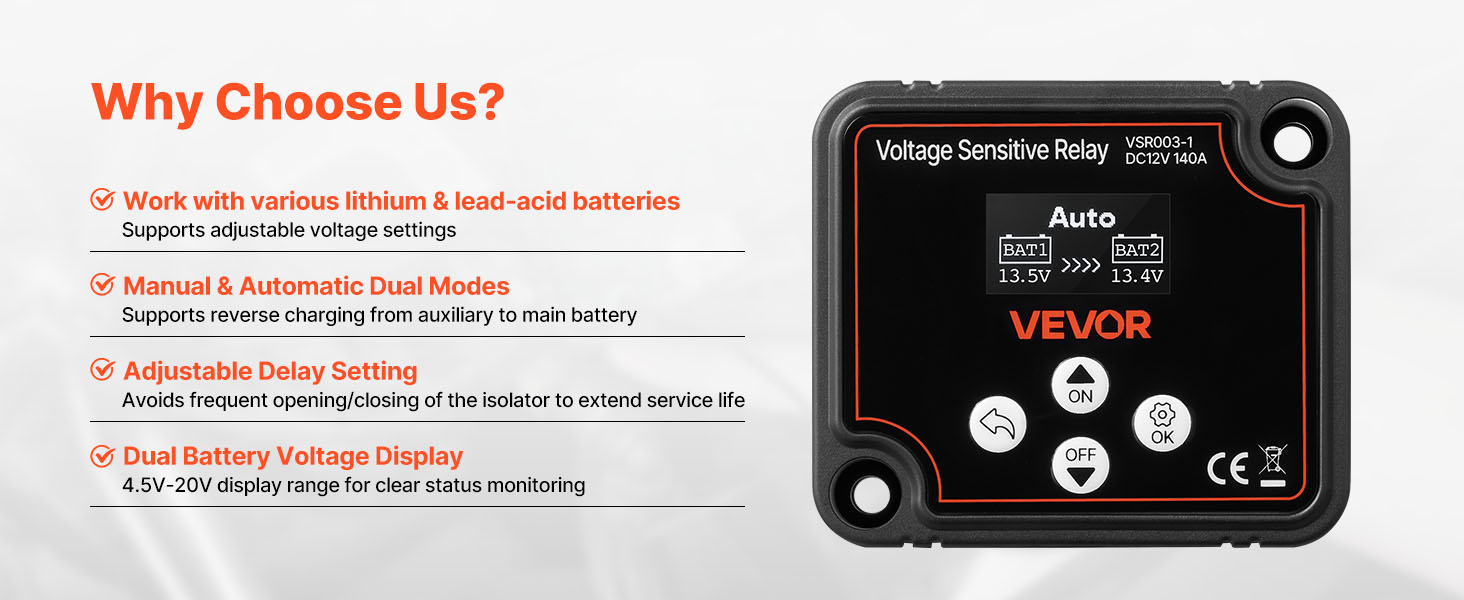 Naše relé citlivé na napätie podporuje nielen flexibilné nastavenie napätia a núdzové reverzné nabíjanie, ale má aj zabudovanú ochranu proti oneskoreniu, aby sa zabránilo stratám pri častom štarte a zastavení. Vrátane zobrazenia dvojitého napätia v reálnom čase vás informuje o stave batérie na spoľahlivé používanie.