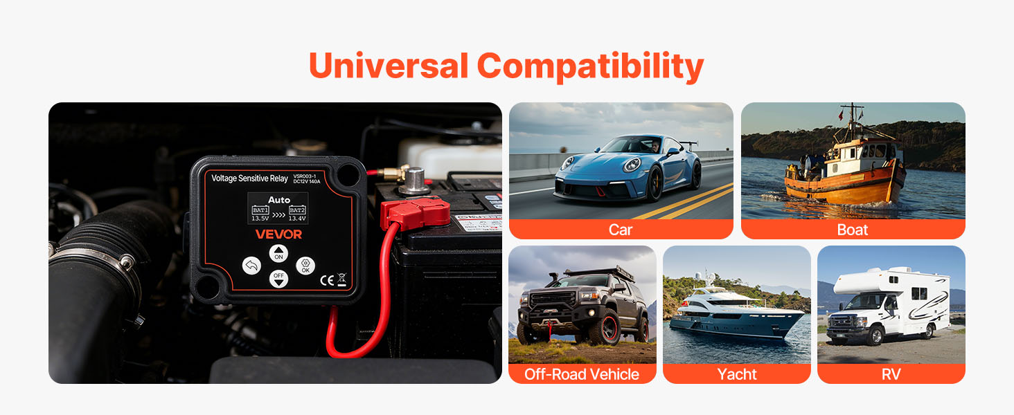 Súprava izolátora dvoch batérií automaticky upravuje nabíjacie napätie podľa rôznych typov batérií. Je široko kompatibilný s rôznymi lítiovými batériami a olovenými batériami, čím zabezpečuje efektívnu prácu rôznych typov batérií.