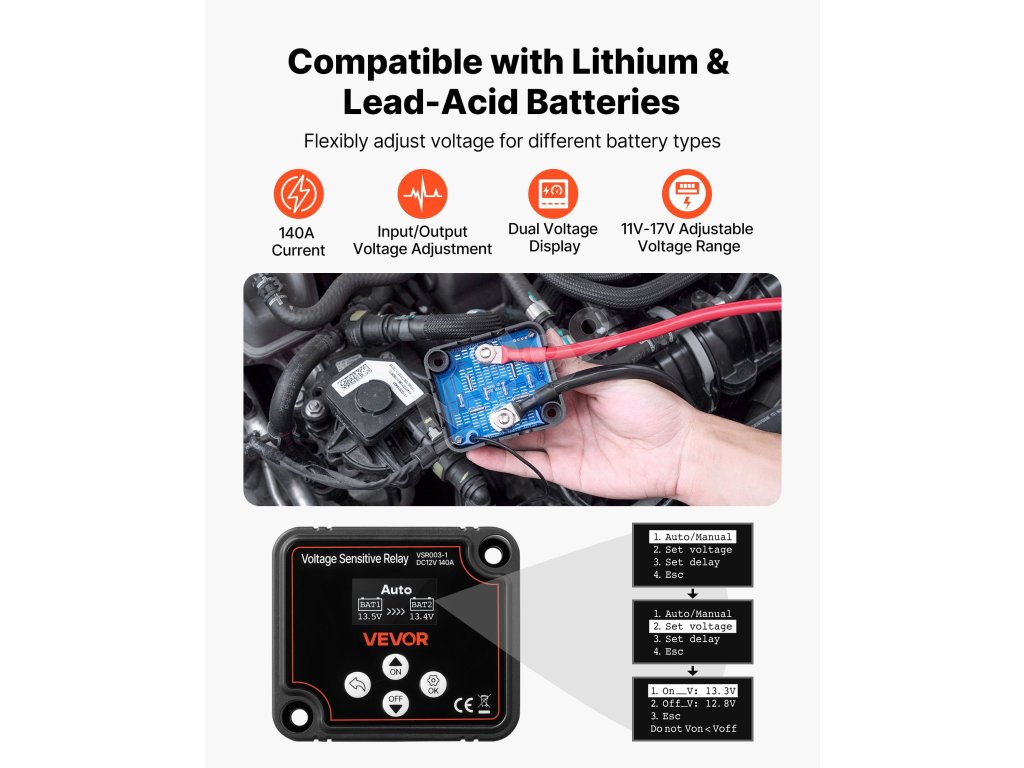 Súprava izolátora dvoch batérií automaticky upravuje nabíjacie napätie podľa rôznych typov batérií. Je široko kompatibilný s rôznymi lítiovými batériami a olovenými batériami, čím zabezpečuje efektívnu prácu rôznych typov batérií.