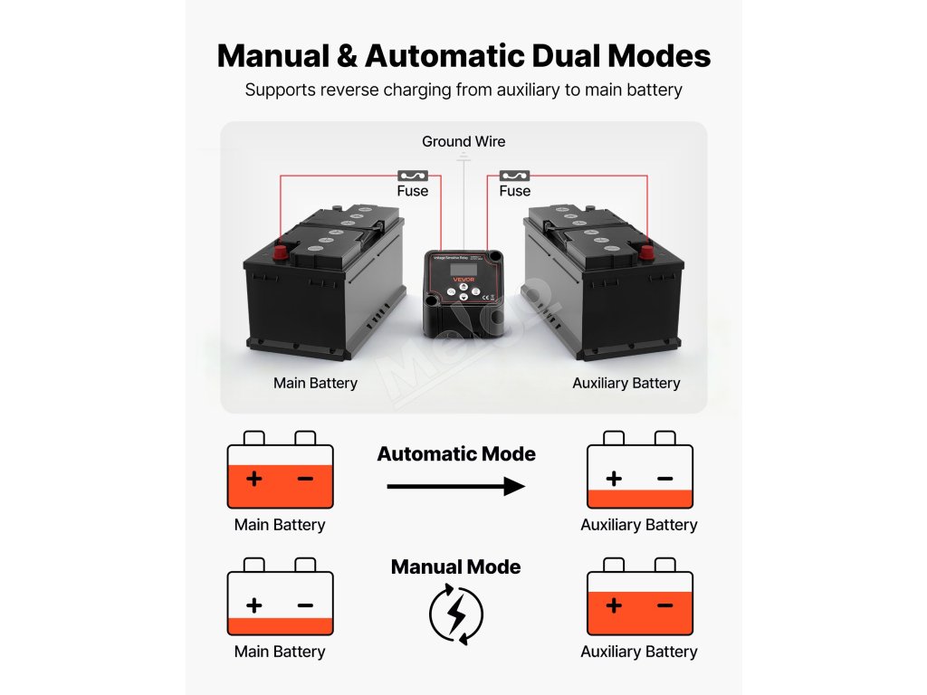 Táto súprava 12 V izolátora s rozdeleným nabíjaním, špeciálne navrhnutá pre systémy dvoch batérií, zabezpečuje súčasné nabíjanie dvoch batérií bez prerušenia napájania zariadenia. Či už vo vašom terénnom vozidle, obytnom vozidle alebo lodi, poskytuje stabilnú a spoľahlivú podporu napájania vašich zariadení.