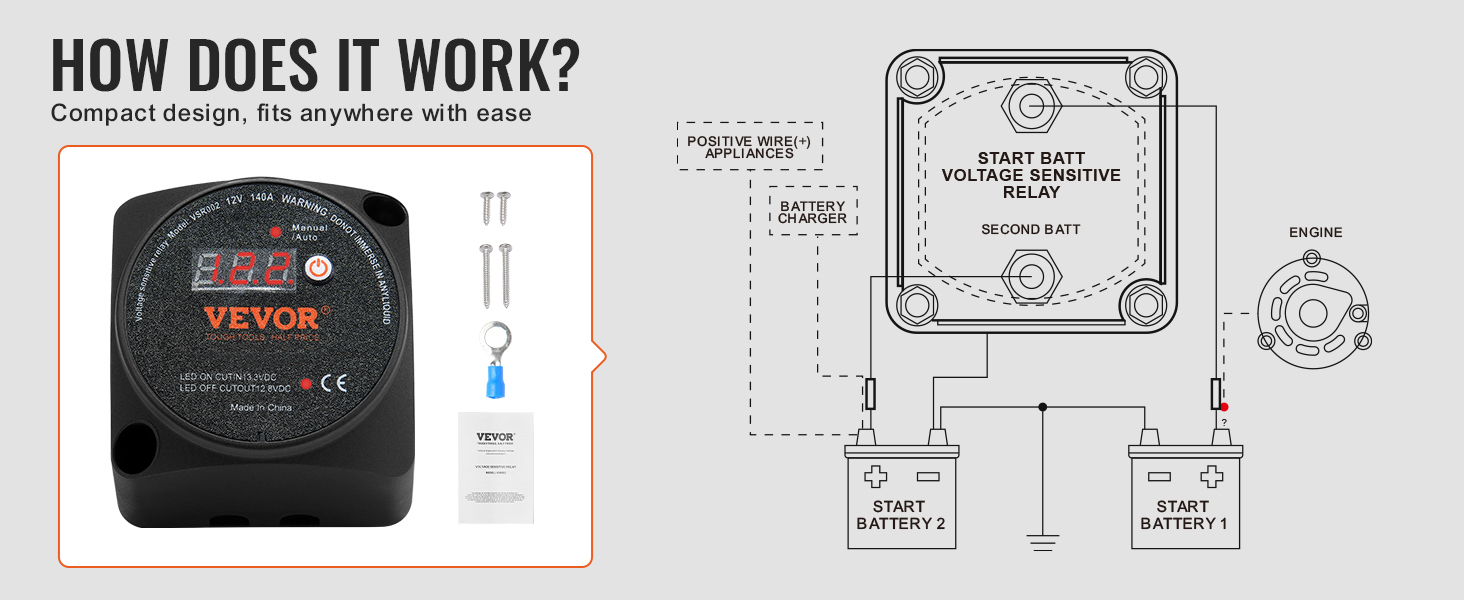 Náš 140A reléový izolátor citlivý na napätie má rozmery len 2,7'' x 2,7'' x 2,2'', takže jeho inštalácia je jednoduchá v akomkoľvek priestore. Dokonale sa hodí na montáž pod kapotu alebo do vnútra terénneho vozidla a bezchybne funguje s vaším systémom dvoch batérií.