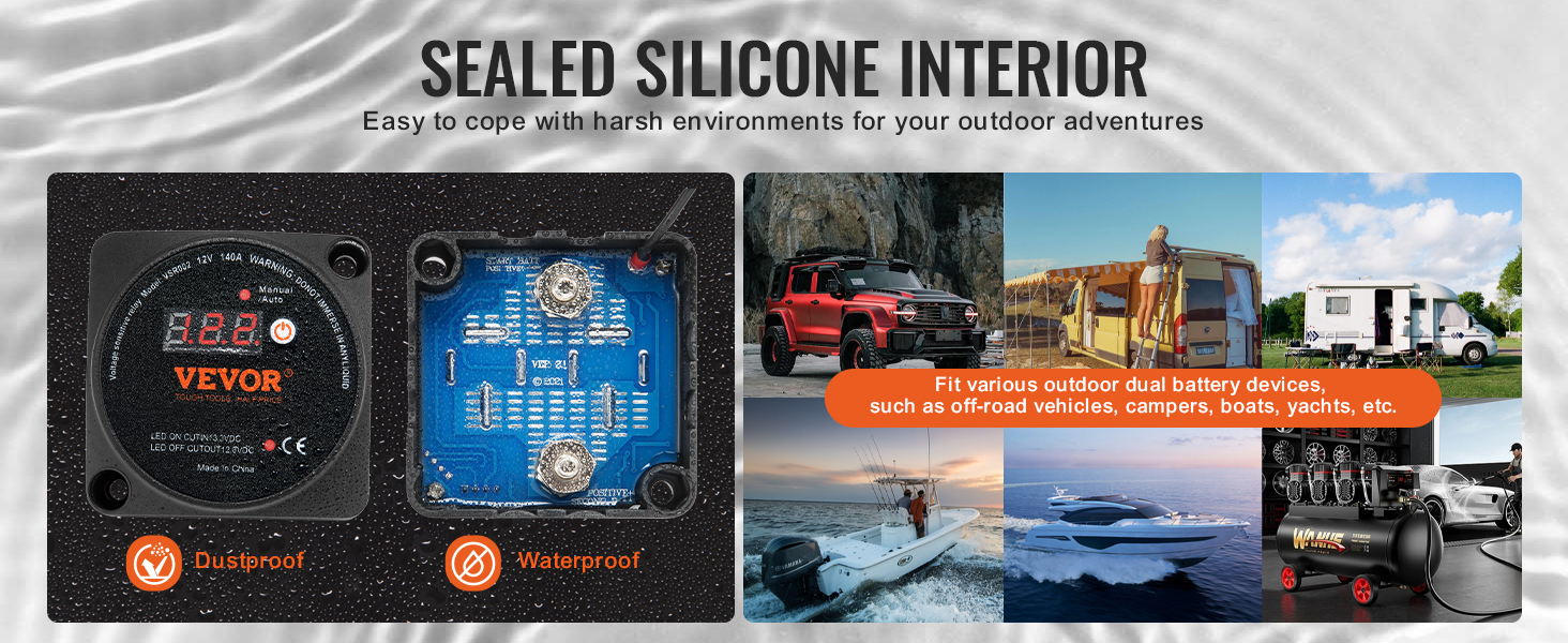 Náš izolátor dvoch batérií má silikónom utesnený interiér, ktorý ponúka spoľahlivú ochranu proti vode, prachu a nepriaznivým podmienkam prostredia a chráni vaše vonkajšie systémy dvoch batérií. Poskytuje spoľahlivý výkon, či už ide o terénne vozidlá, obytné automobily, jachty alebo lode.