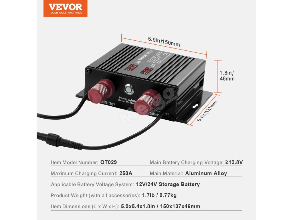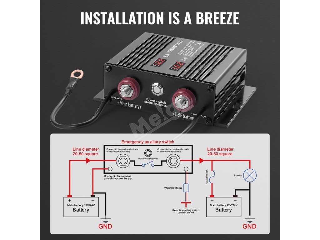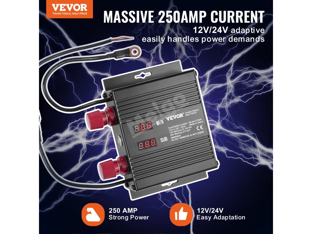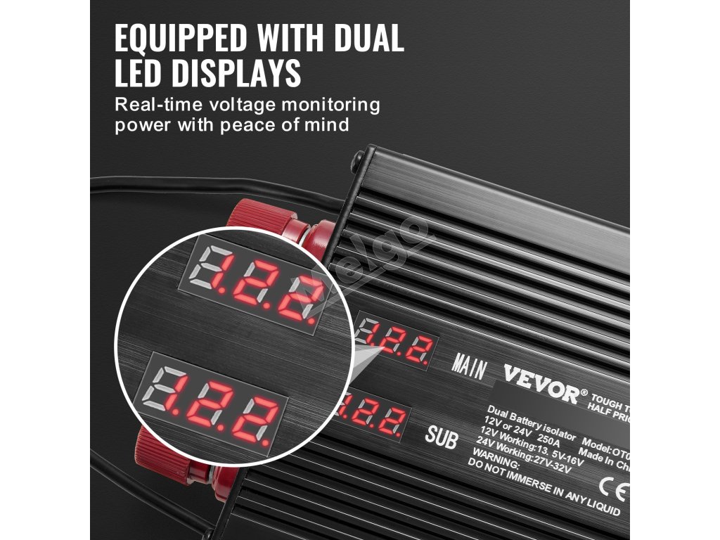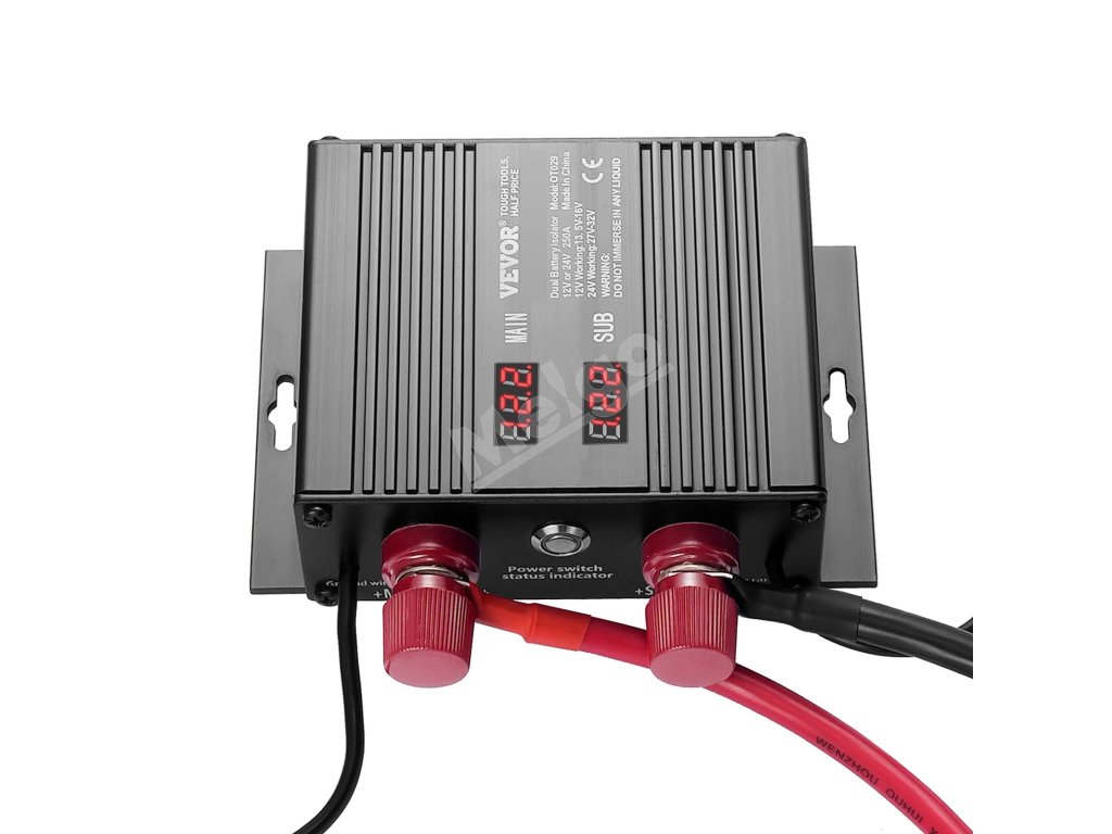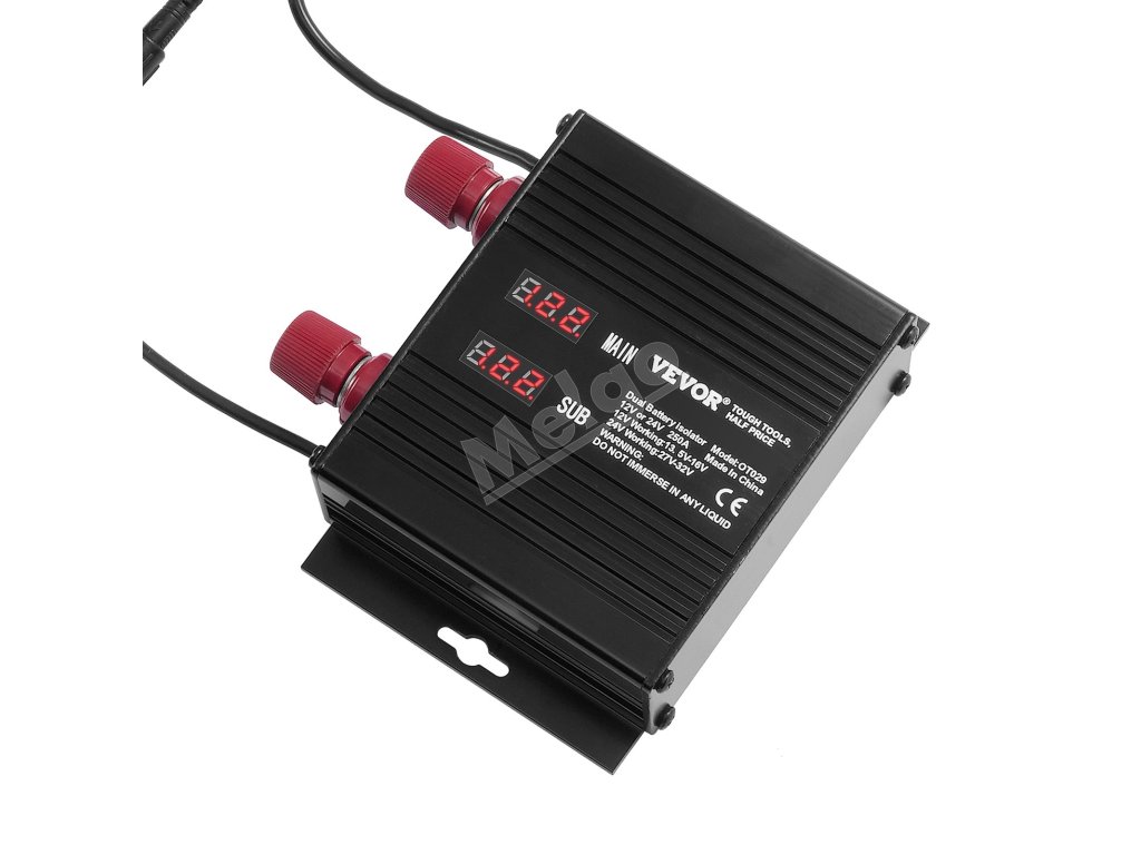 Náš 250A batériový izolátor je inteligentne prispôsobený pre 12V alebo 24V systémy. Vďaka dvom LED displejom na monitorovanie stavu batérie v reálnom čase, inteligentnej funkcii rozpoznávania napätia a viacnásobnej ochrane je spoľahlivou podporou na vašich cestách. Užite si stabilnú a bezpečnú cestu!