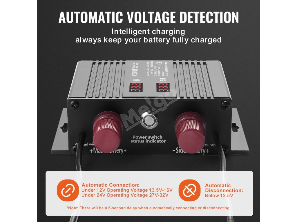 Náš inteligentný izolátor batérií sa automaticky pripojí, keď je rozsah napätia 13,5 V - 16 V pri pracovnom napätí 12 V a 27 V - 32 V pri pracovnom napätí 24 V. A keď je napätie < 12,5 V, prúd sa automaticky odpojí. Stlačením núdzového tlačidla môžete okamžite použiť sekundárnu batériu.