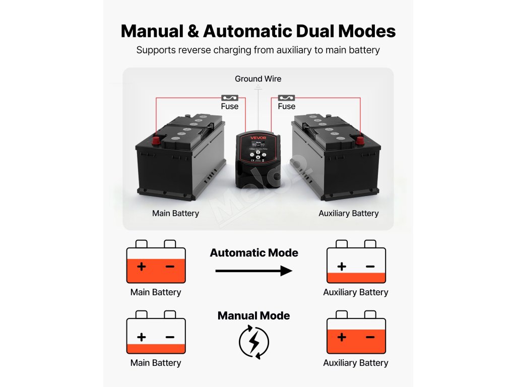 Táto súprava 12 V izolátora s rozdeleným nabíjaním, špeciálne navrhnutá pre systémy dvoch batérií, zabezpečuje súčasné nabíjanie dvoch batérií bez prerušenia napájania zariadenia. Či už vo vašom terénnom vozidle, obytnom vozidle alebo lodi, poskytuje stabilnú a spoľahlivú podporu napájania vašich zariadení.
